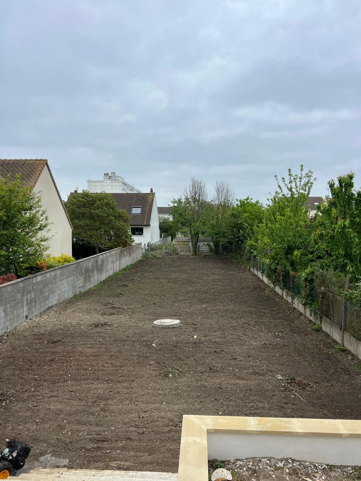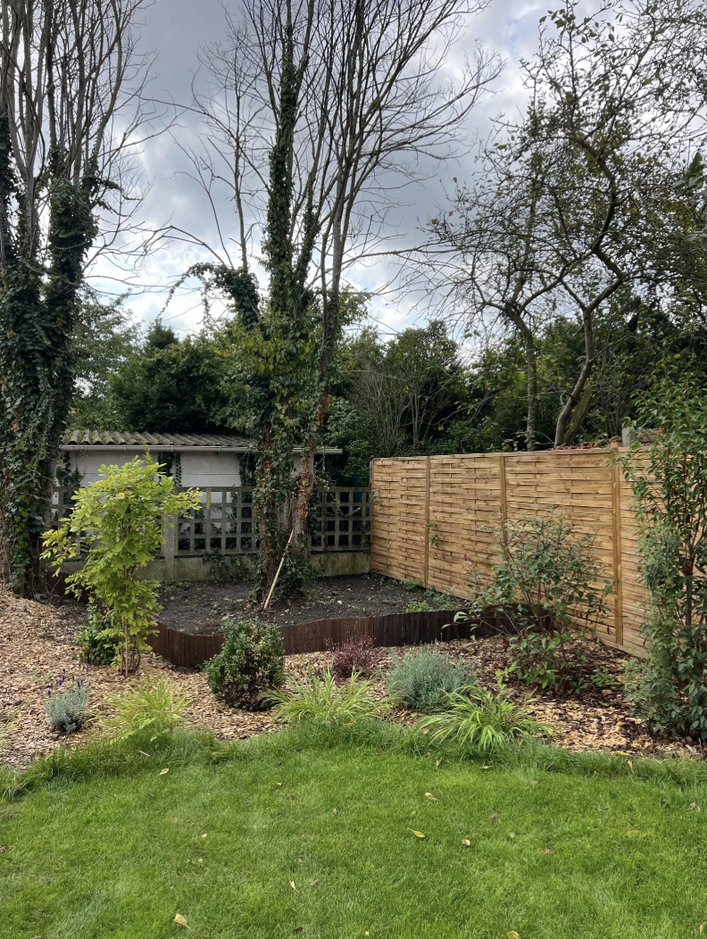 L’espace extérieur a été élégamment aménagé, mêlant fonctionnalité et esthétique, avec des zones distinctes délimitées par des variations subtiles de gazon, des massifs colorés de plantes vivaces et un paillage en bois naturel. Un trampoline intégré dans un massif offre un coin ludique tout en préservant la fluidité du jardin, tandis que trois cèdres stratégiquement placés apportent ombre et intimité. L’ensemble est harmonieux, avec une circulation fluide entre les zones, alliant praticité et confort pour profiter pleinement de l'extérieur.