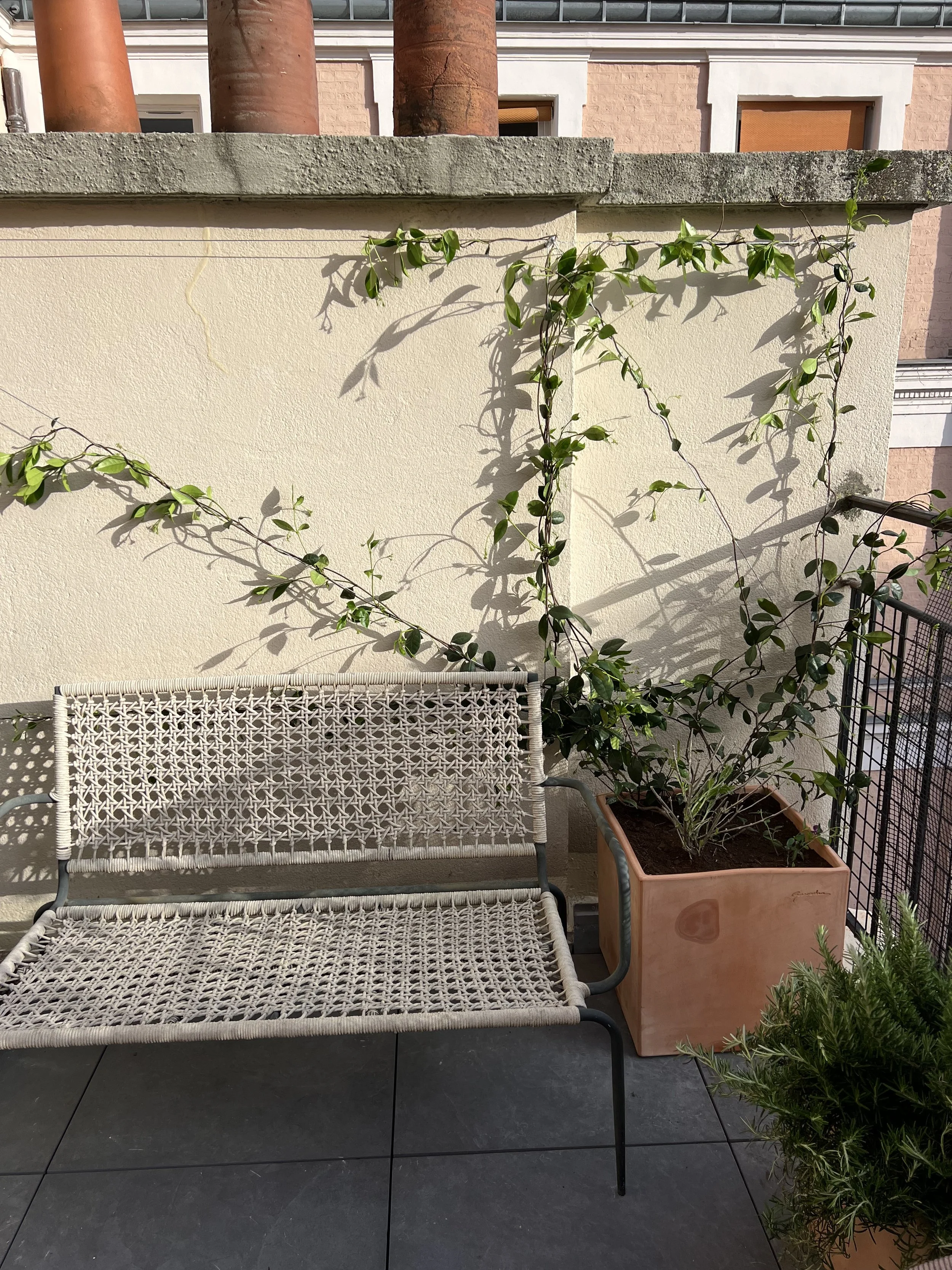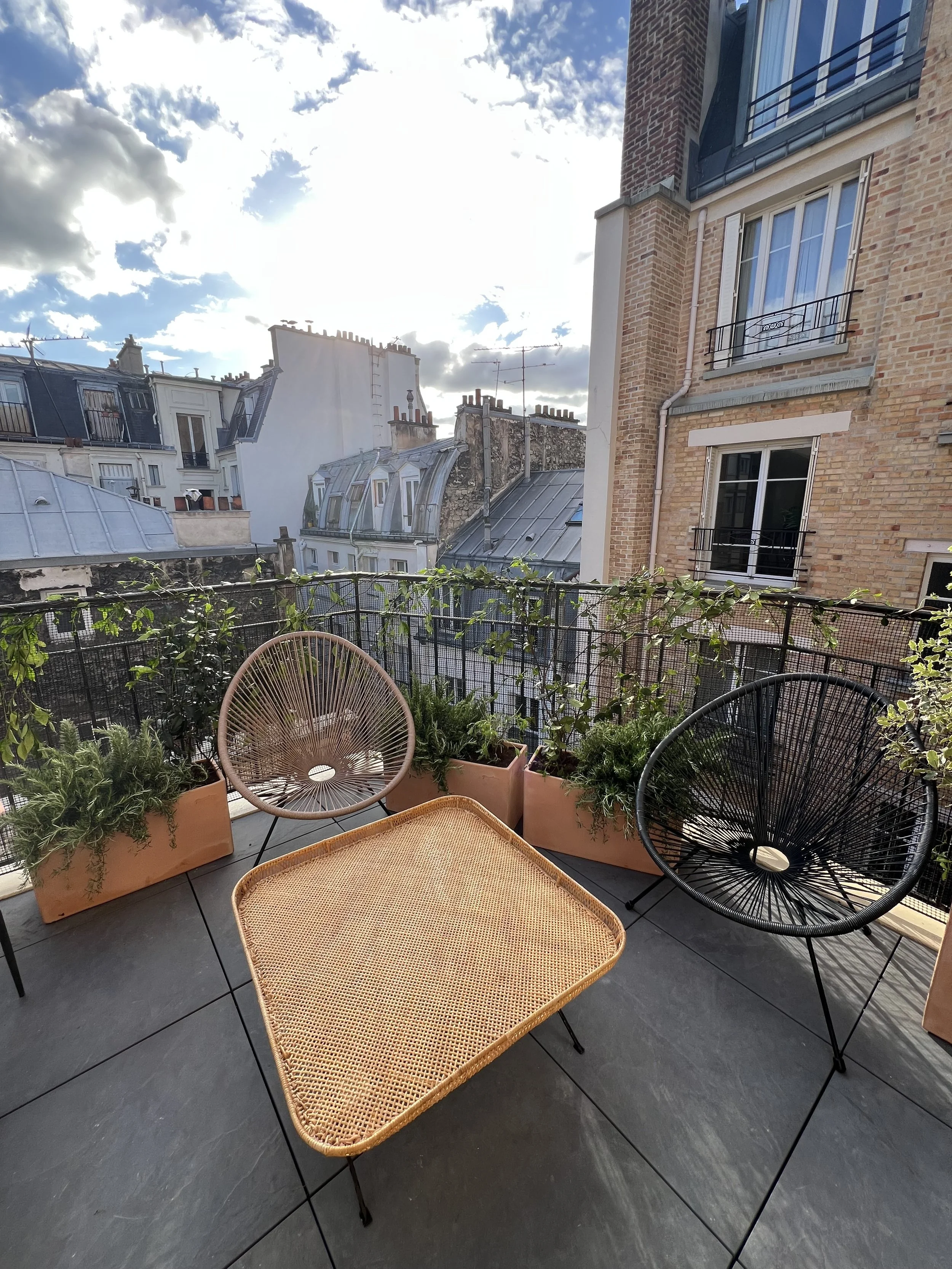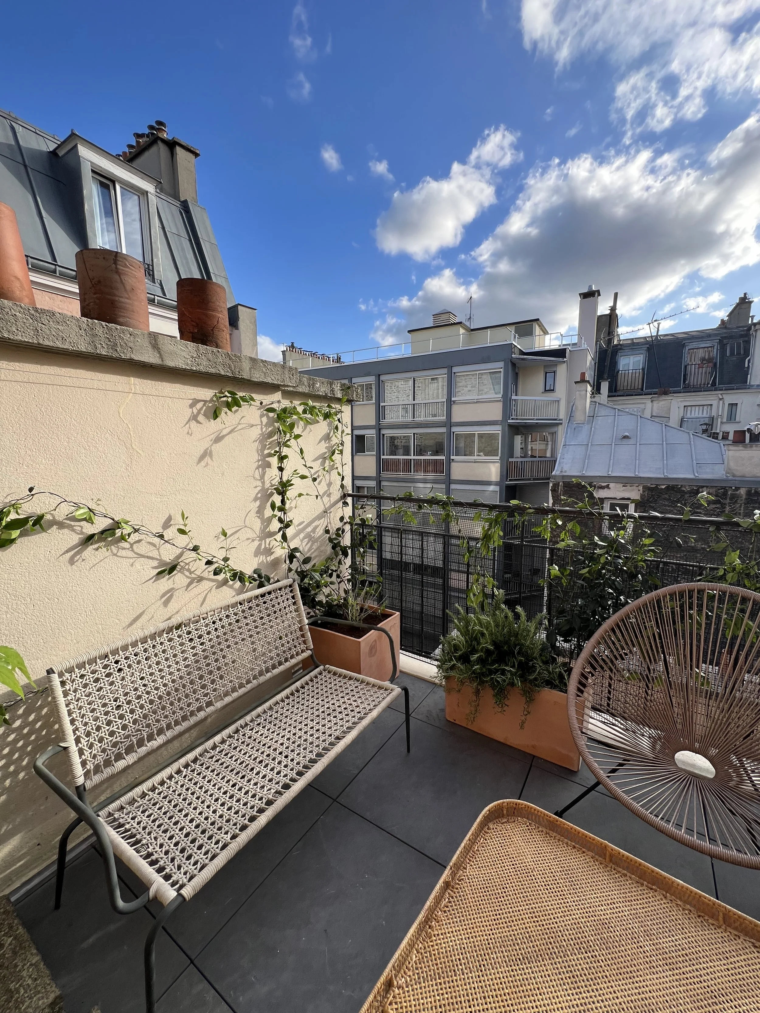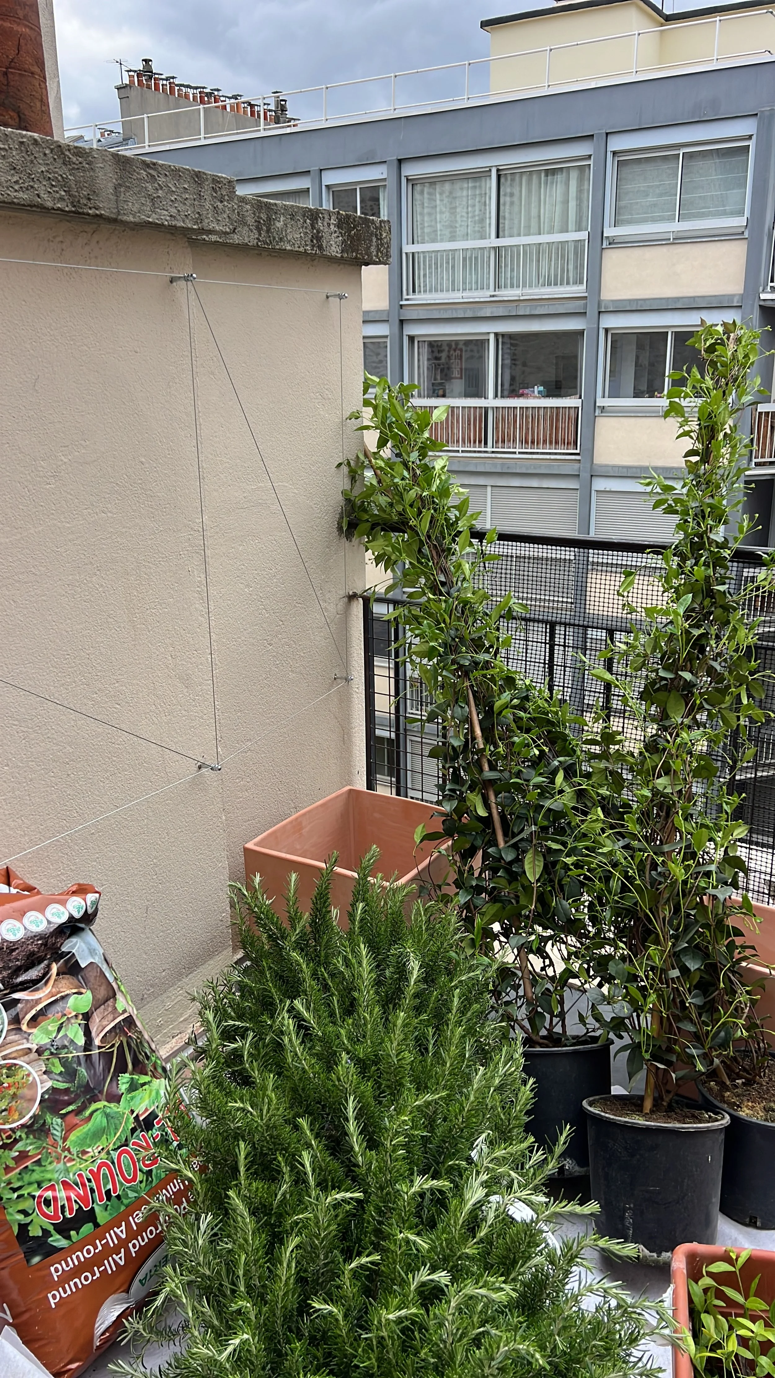 Cette terrasse, entièrement vide au départ, a été transformée en un véritable coin de verdure grâce à l'ajout de pots en terre cuite, de mobilier et de plantations soigneusement disposées. Les plantes, choisies pour leur capacité à prendre du volume, ont été placées à chaque angle de la terrasse pour créer de l’intimité et structurer agréablement l’espace.