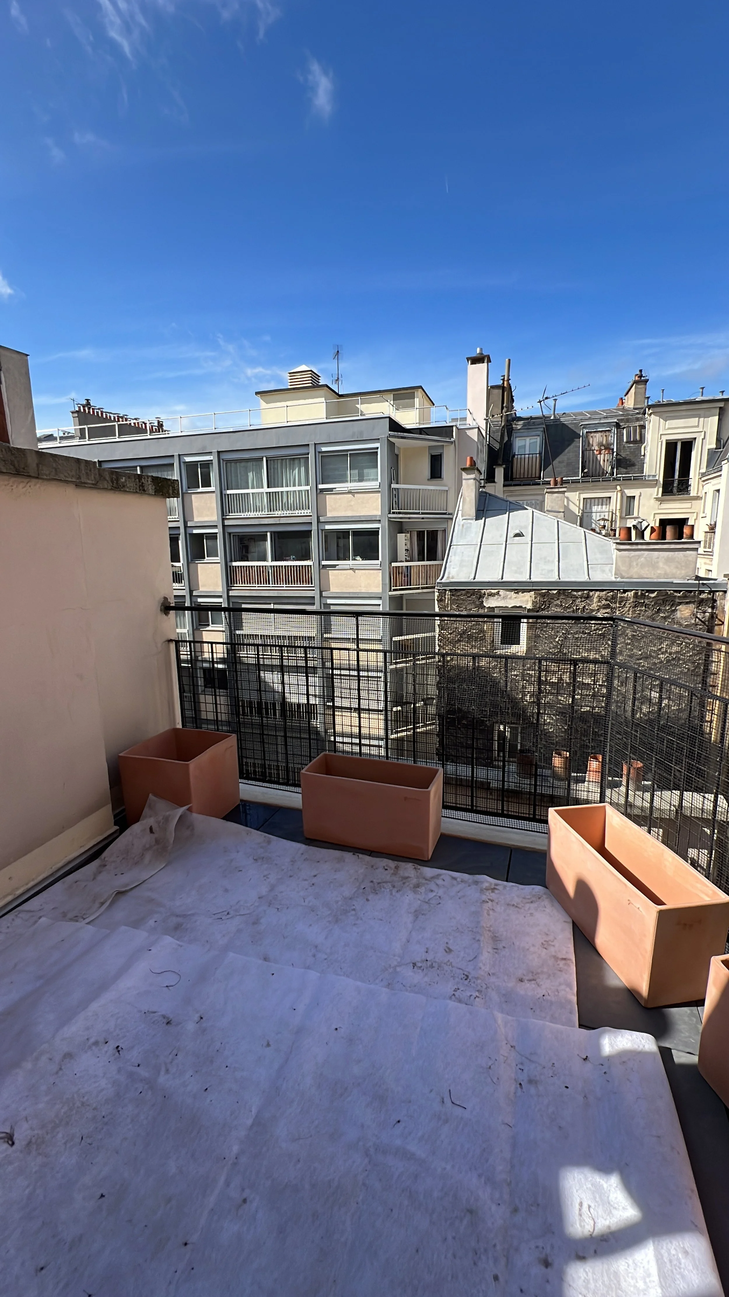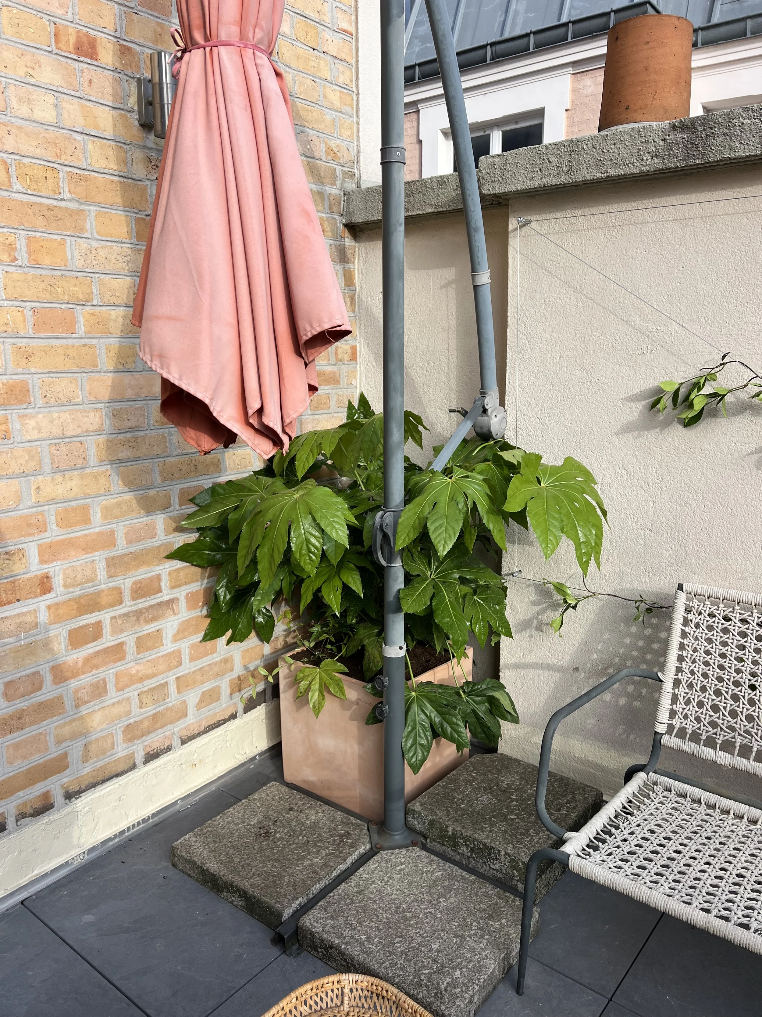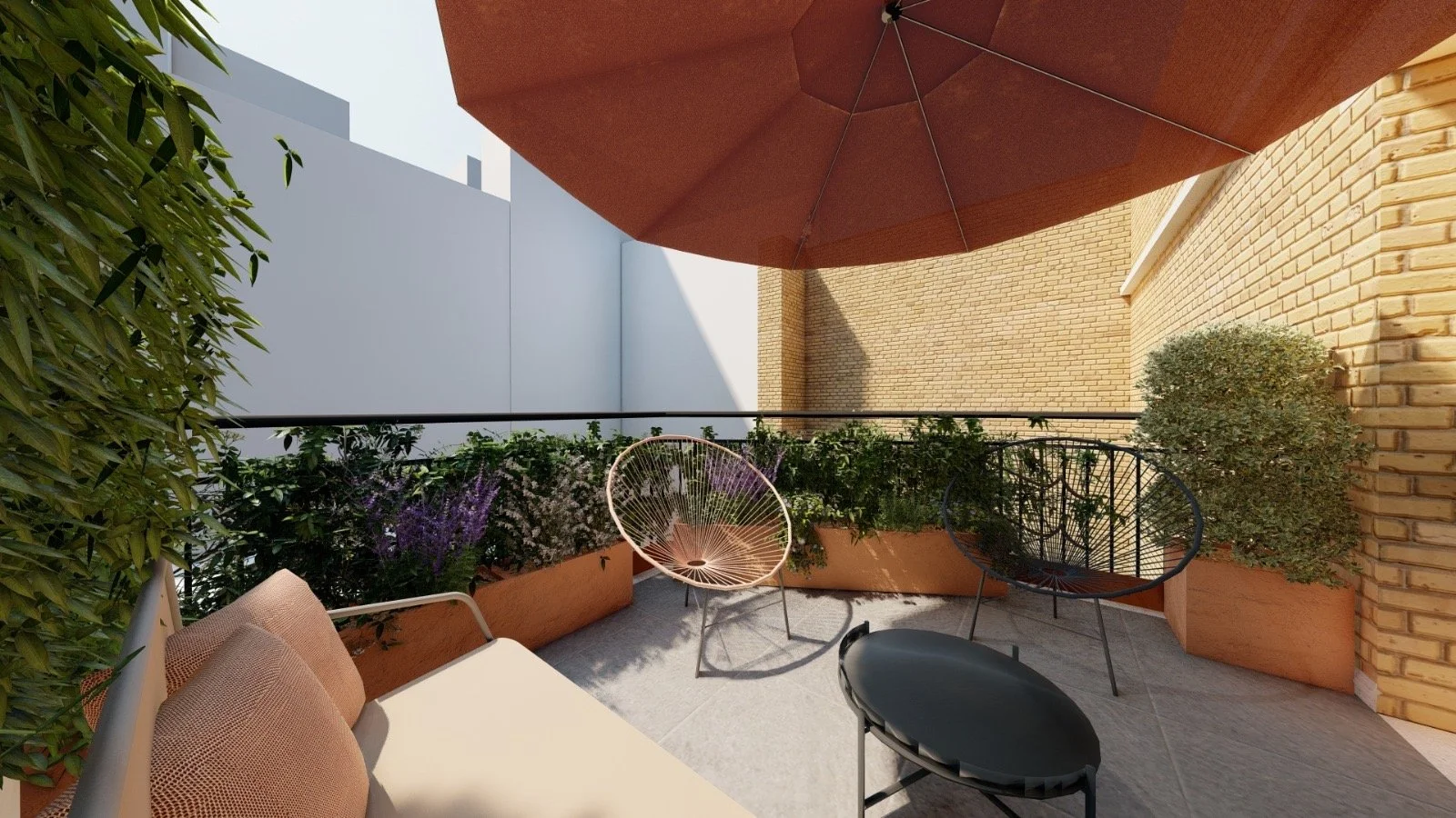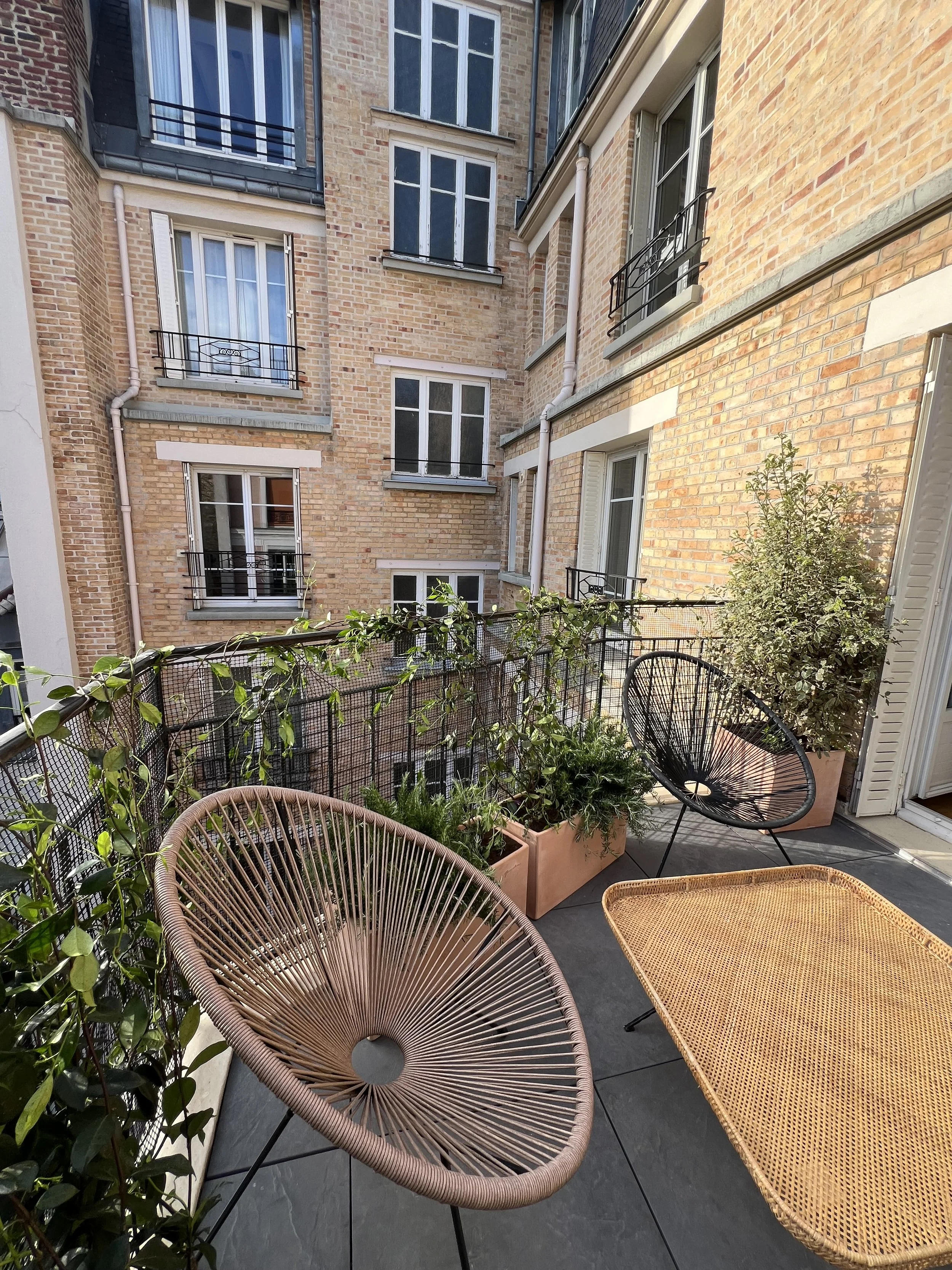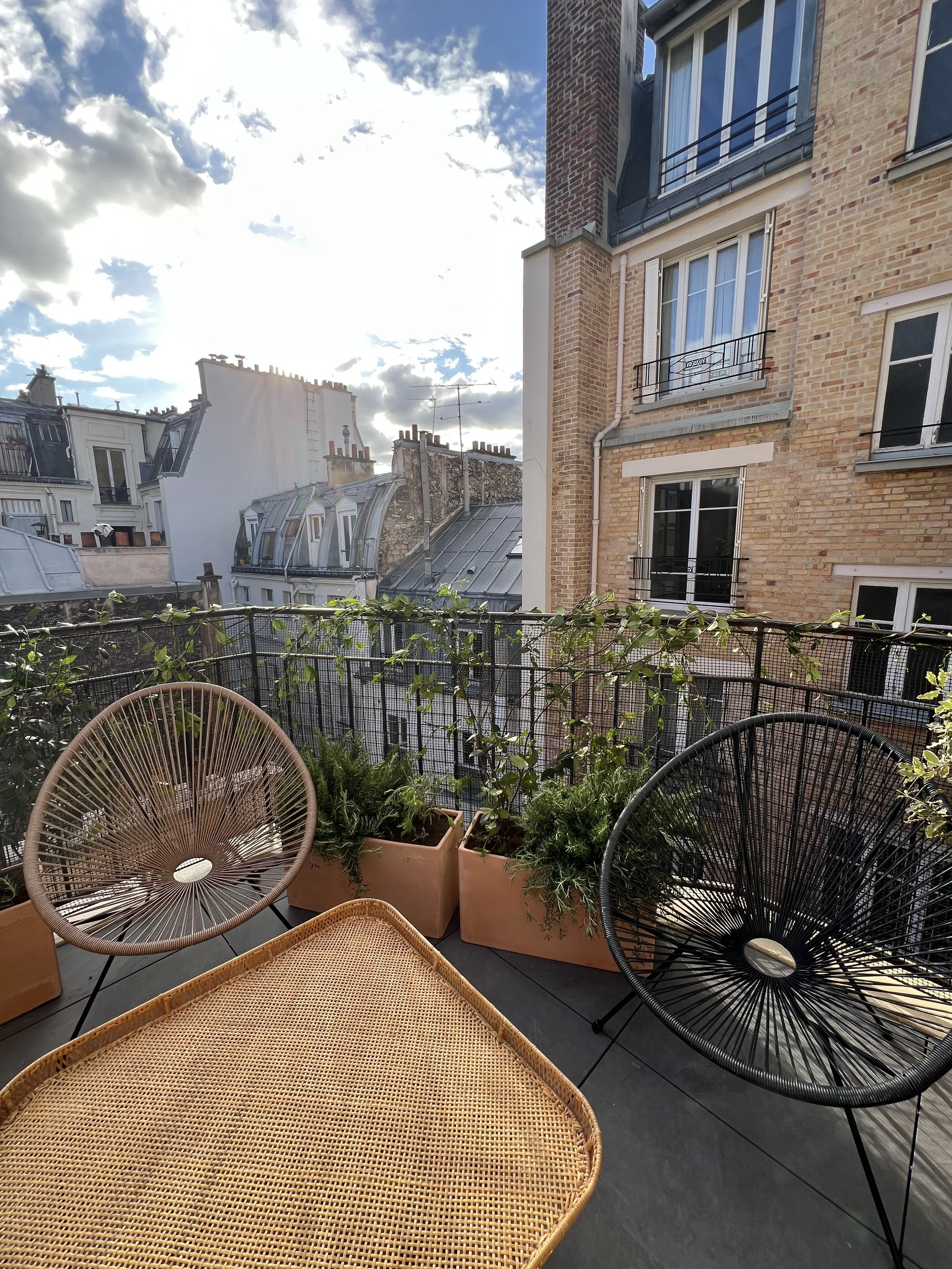 Cette terrasse, entièrement vide au départ, a été transformée en un véritable coin de verdure grâce à l'ajout de pots en terre cuite, de mobilier et de plantations soigneusement disposées. Les plantes, choisies pour leur capacité à prendre du volume, ont été placées à chaque angle de la terrasse pour créer de l’intimité et structurer agréablement l’espace.