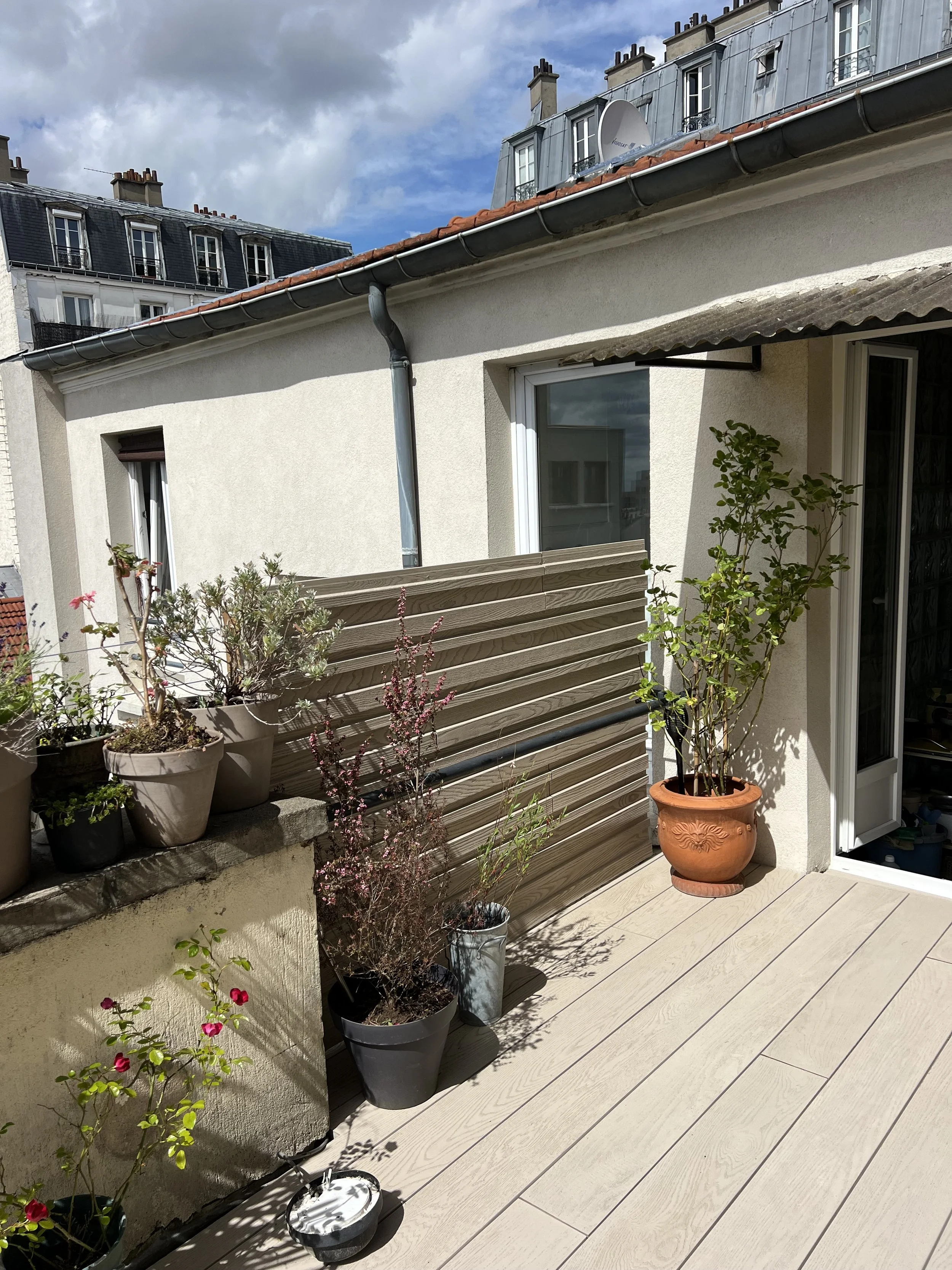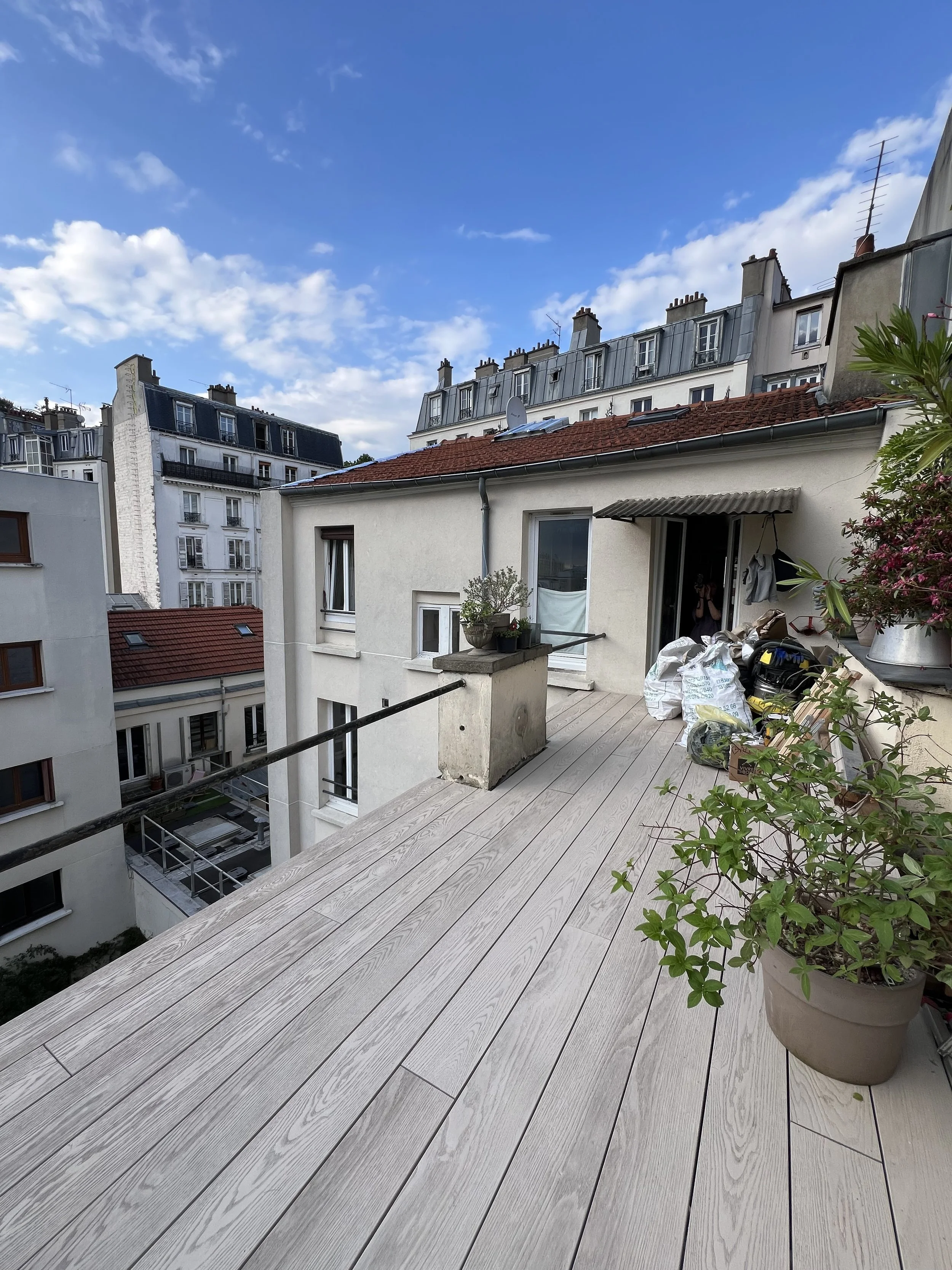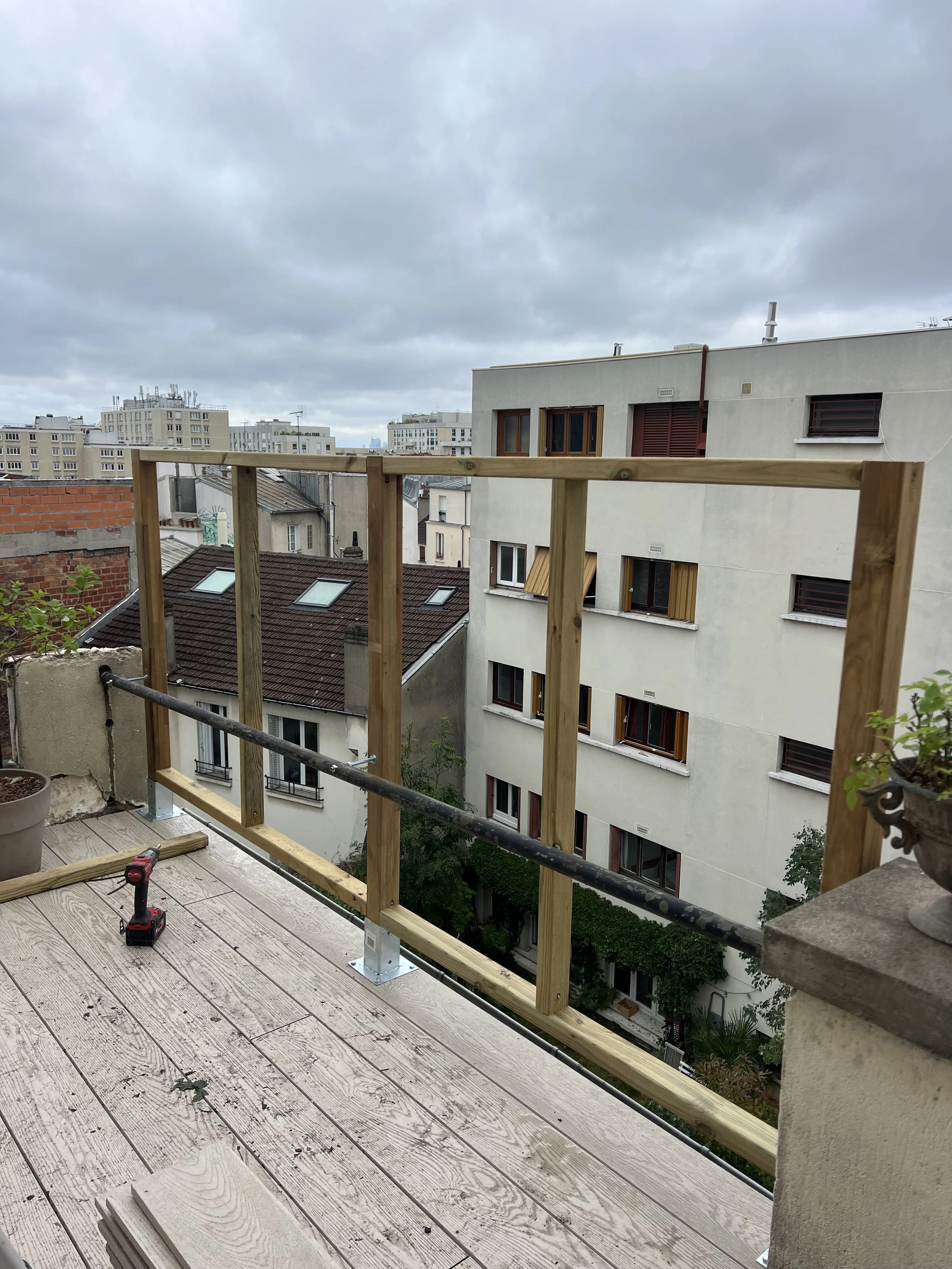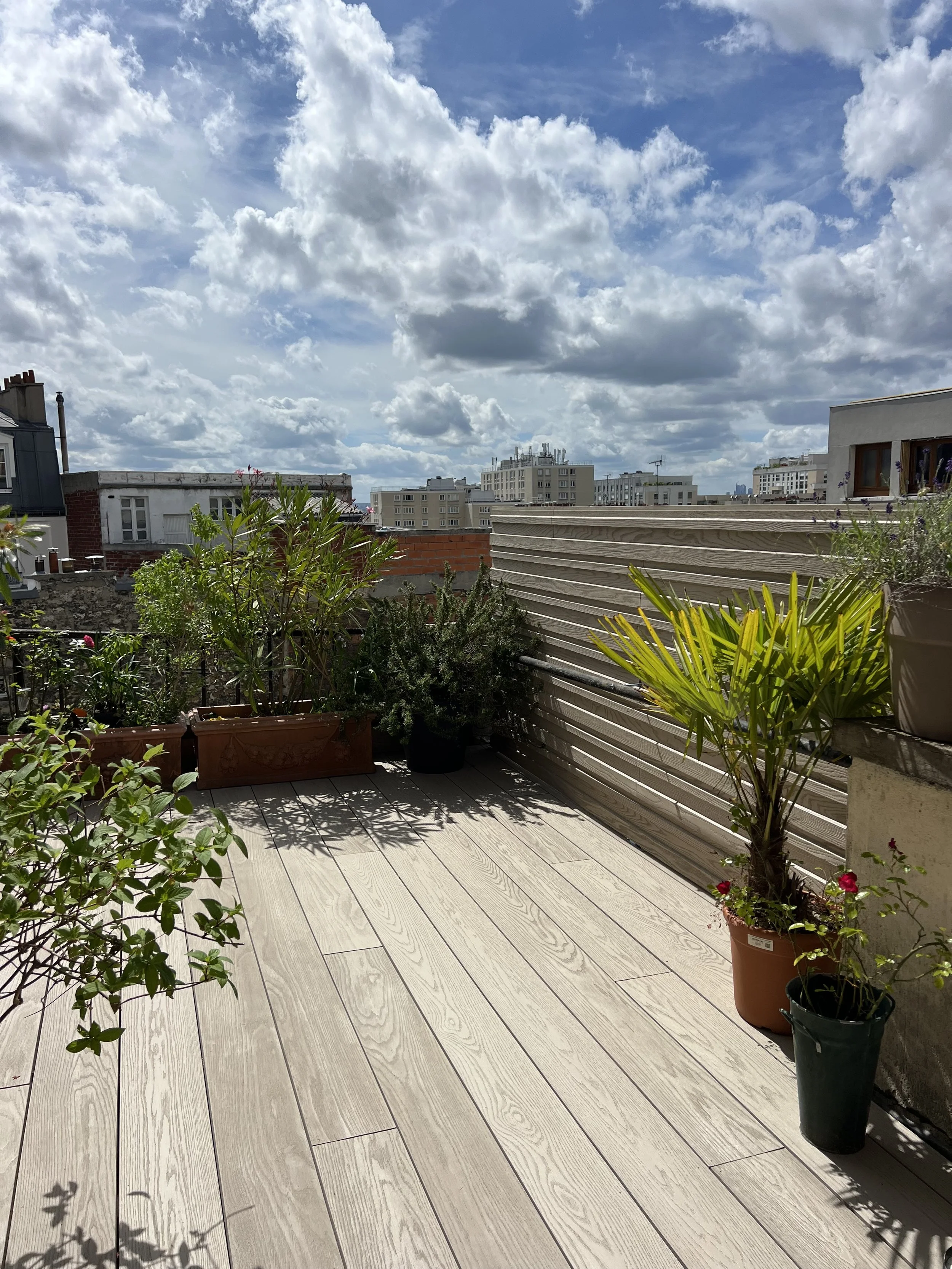 Les claustras assortis en Millboard offrent une continuité visuelle et protègent du vis-à-vis latéral, tout en préservant une vue dégagée sur la Tour Eiffel.