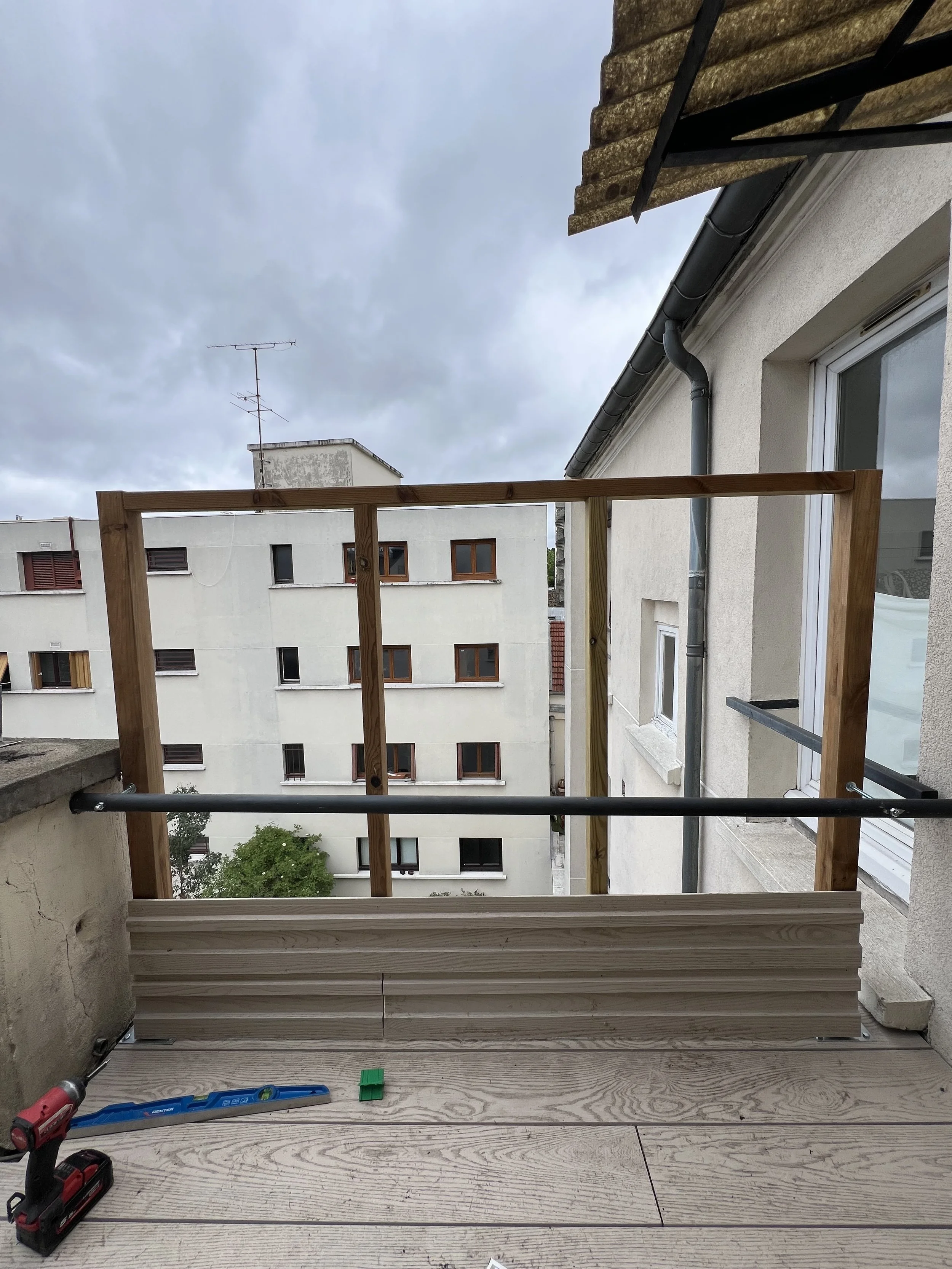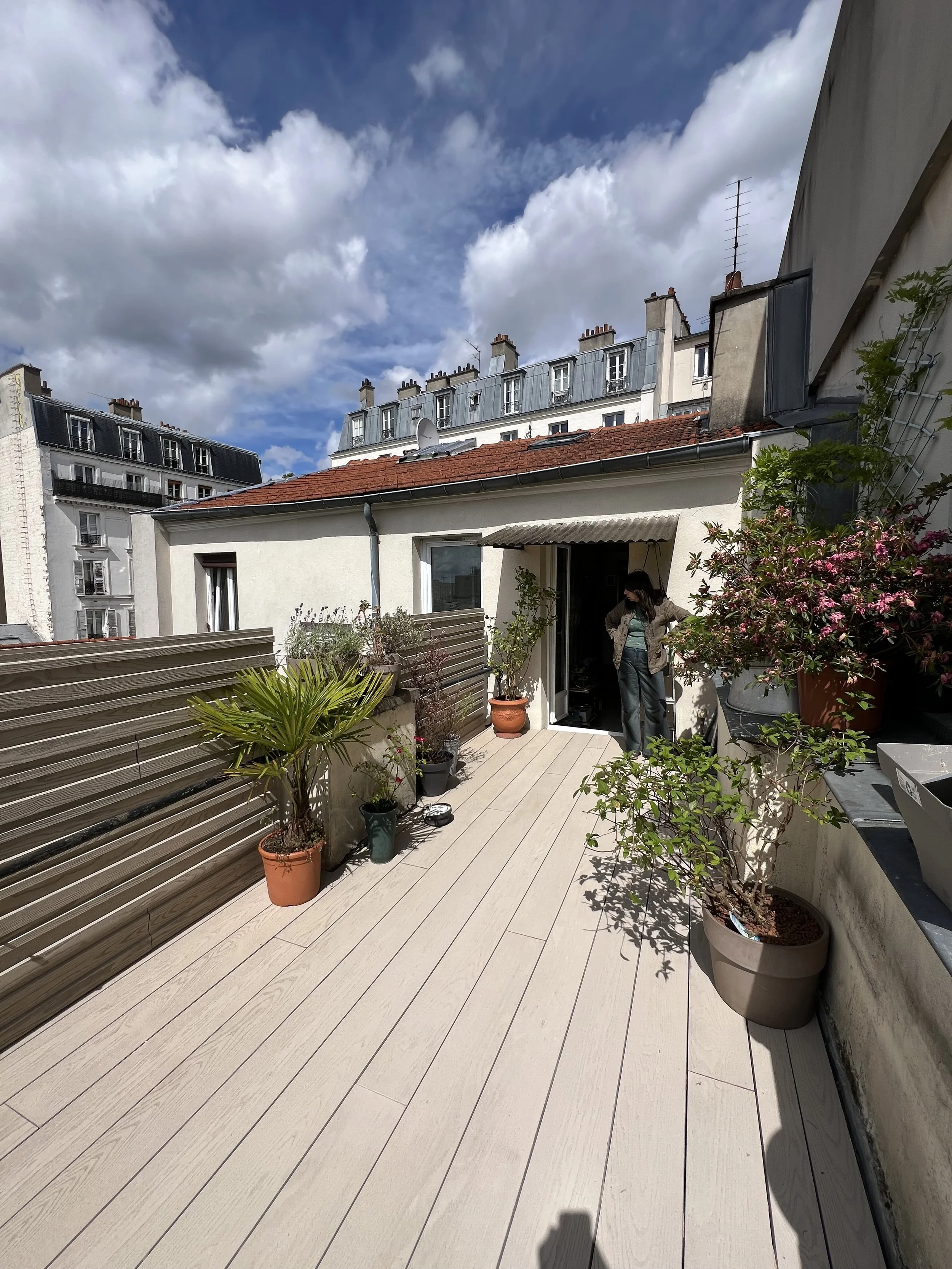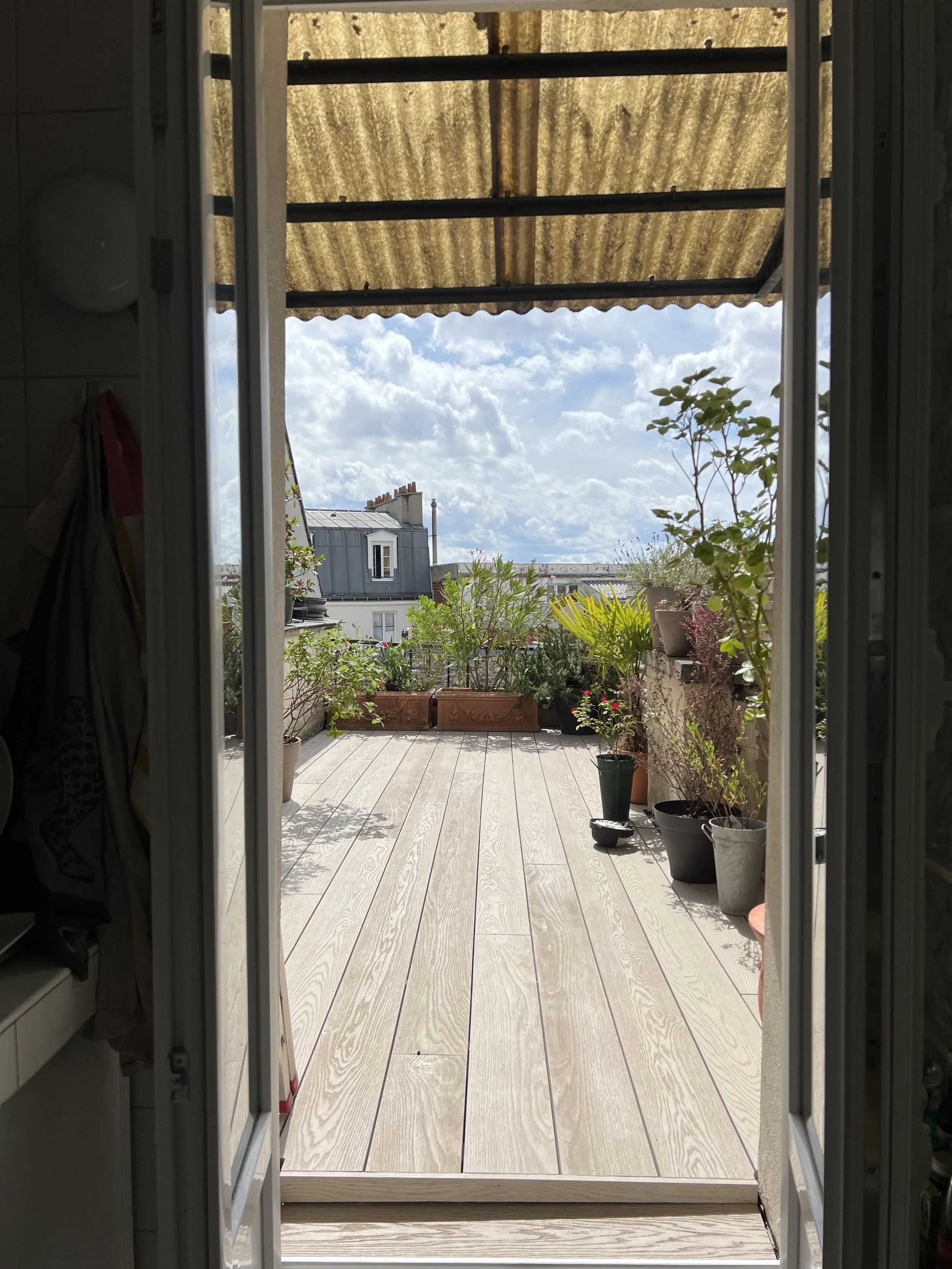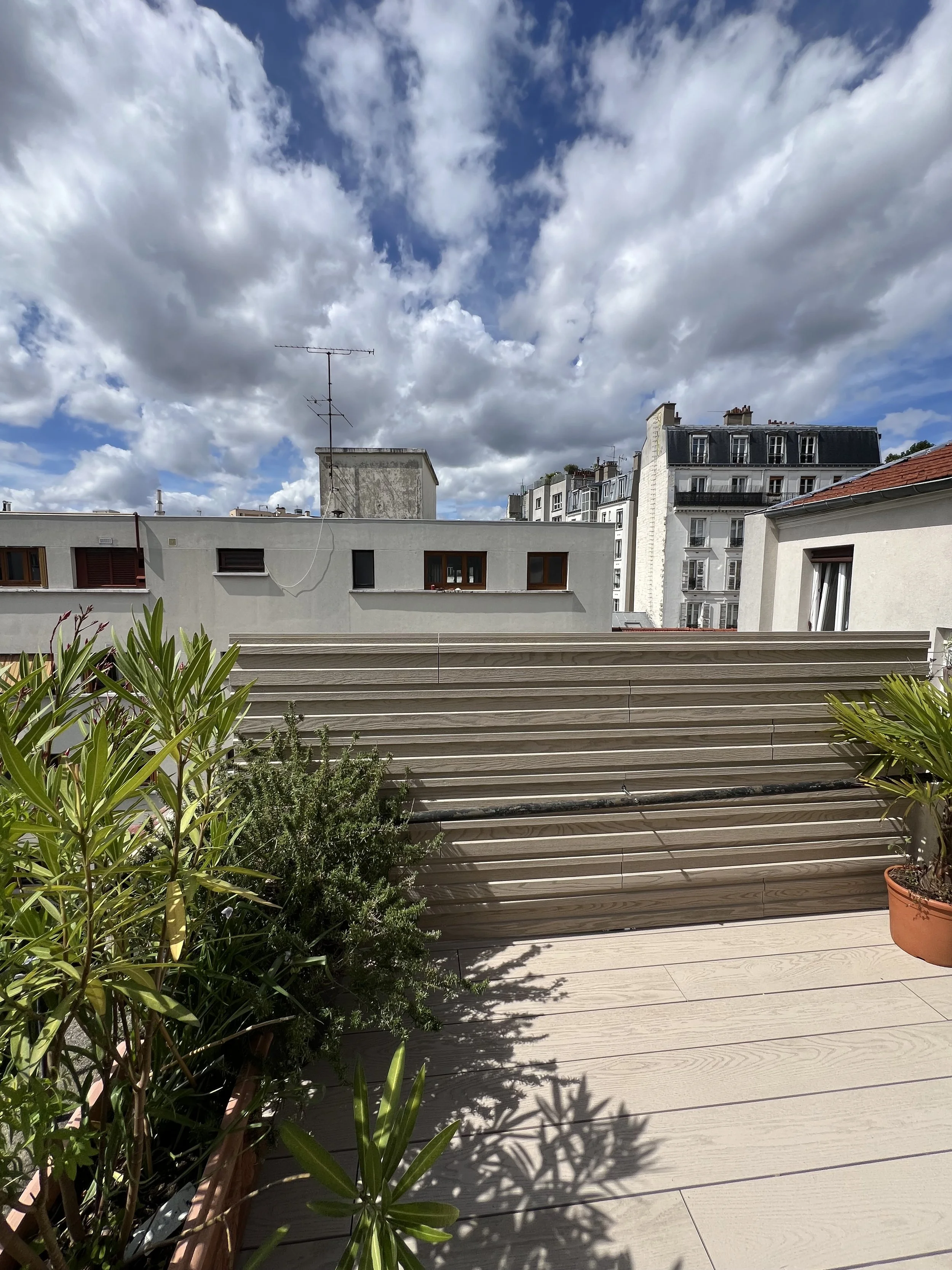 Les claustras assortis en Millboard offrent une continuité visuelle et protègent du vis-à-vis latéral, tout en préservant une vue dégagée sur la Tour Eiffel.