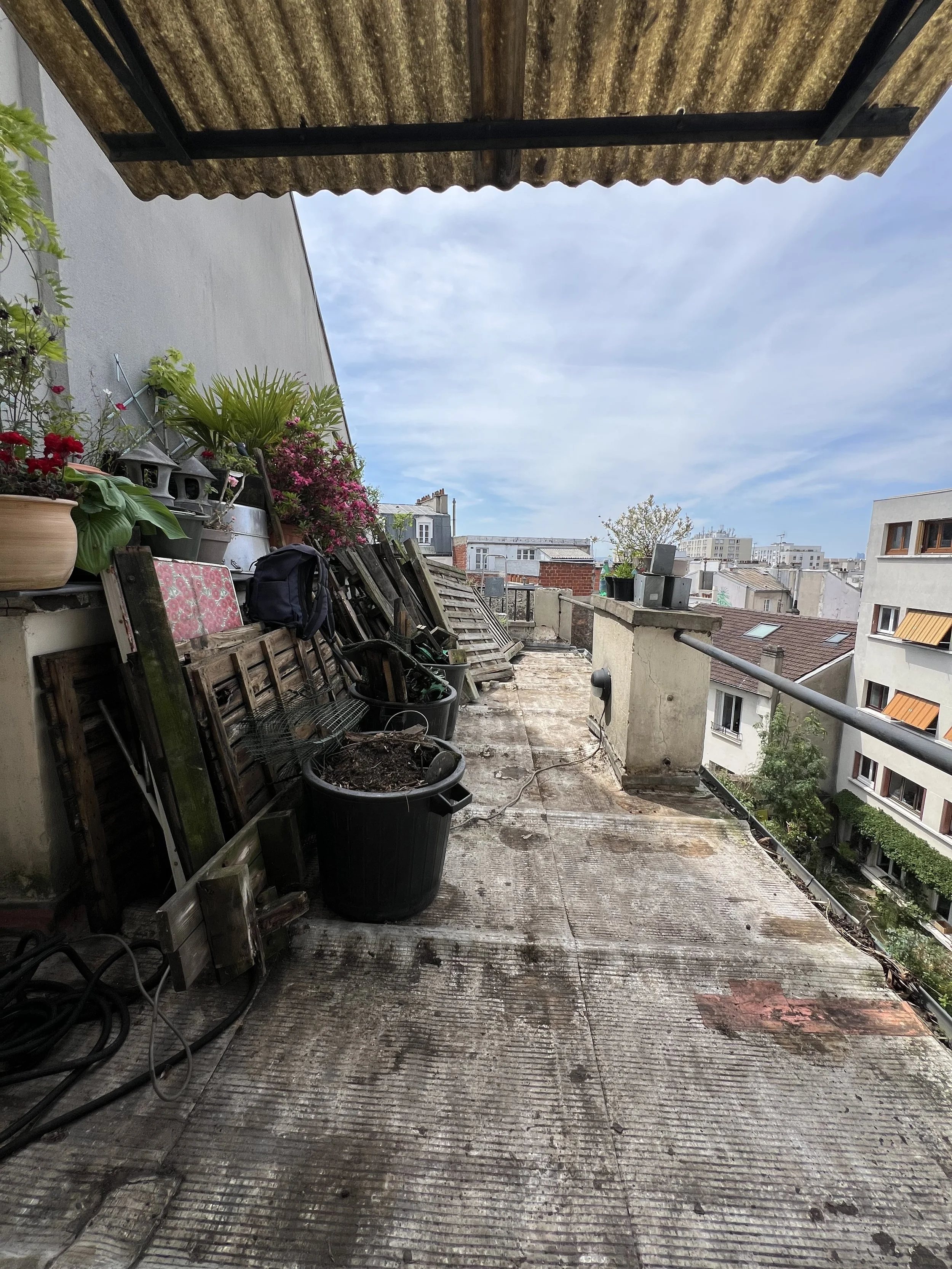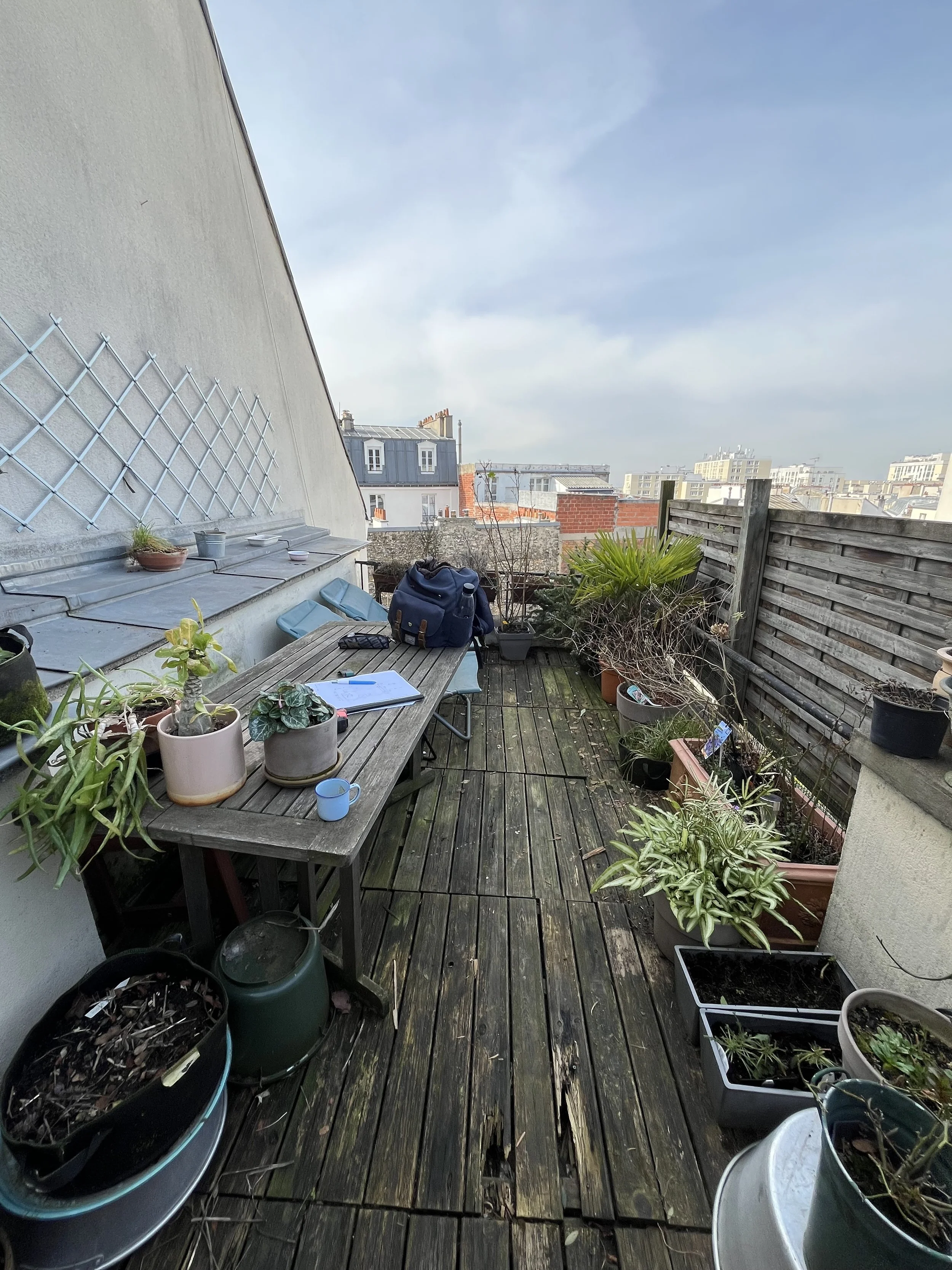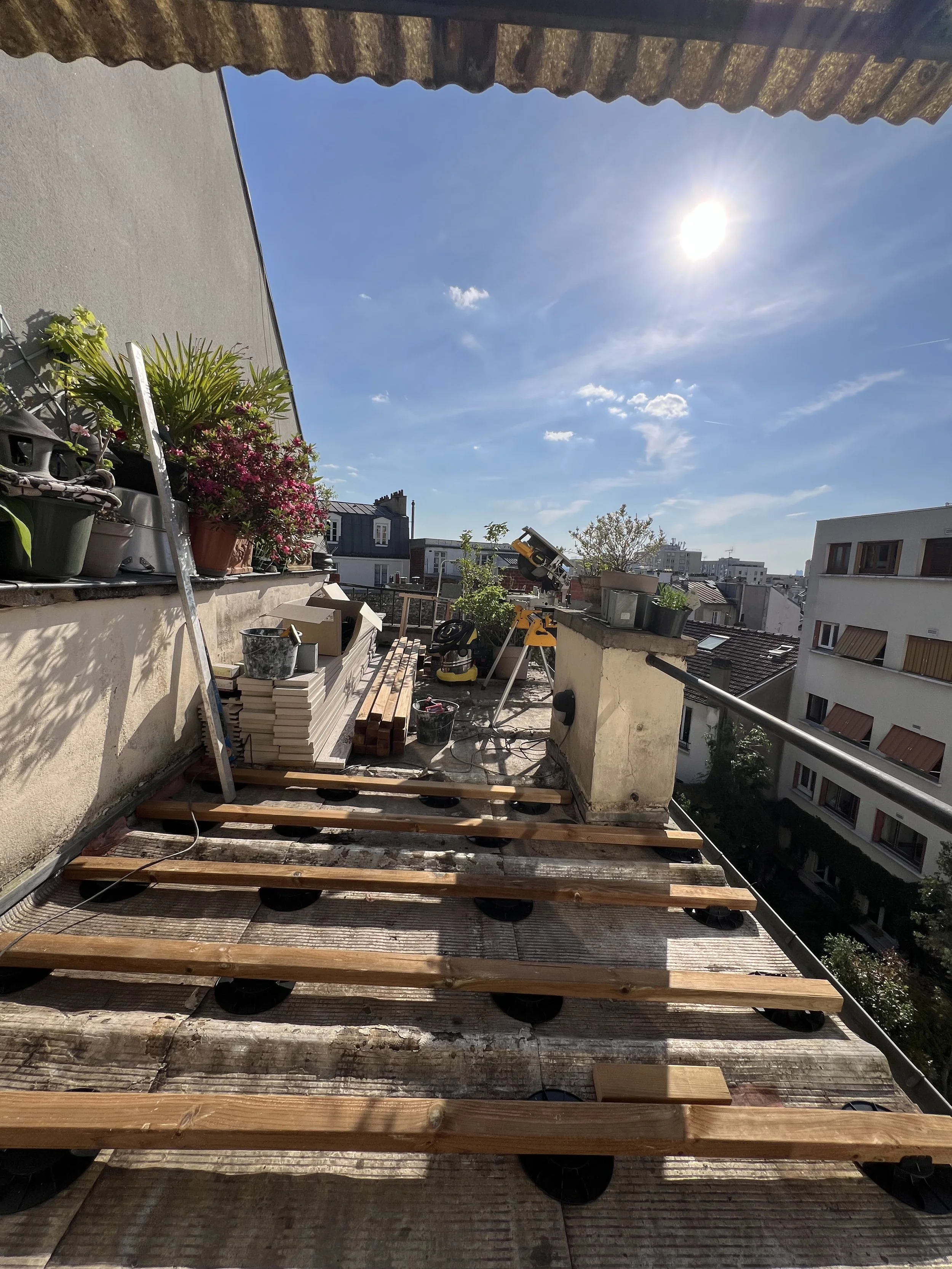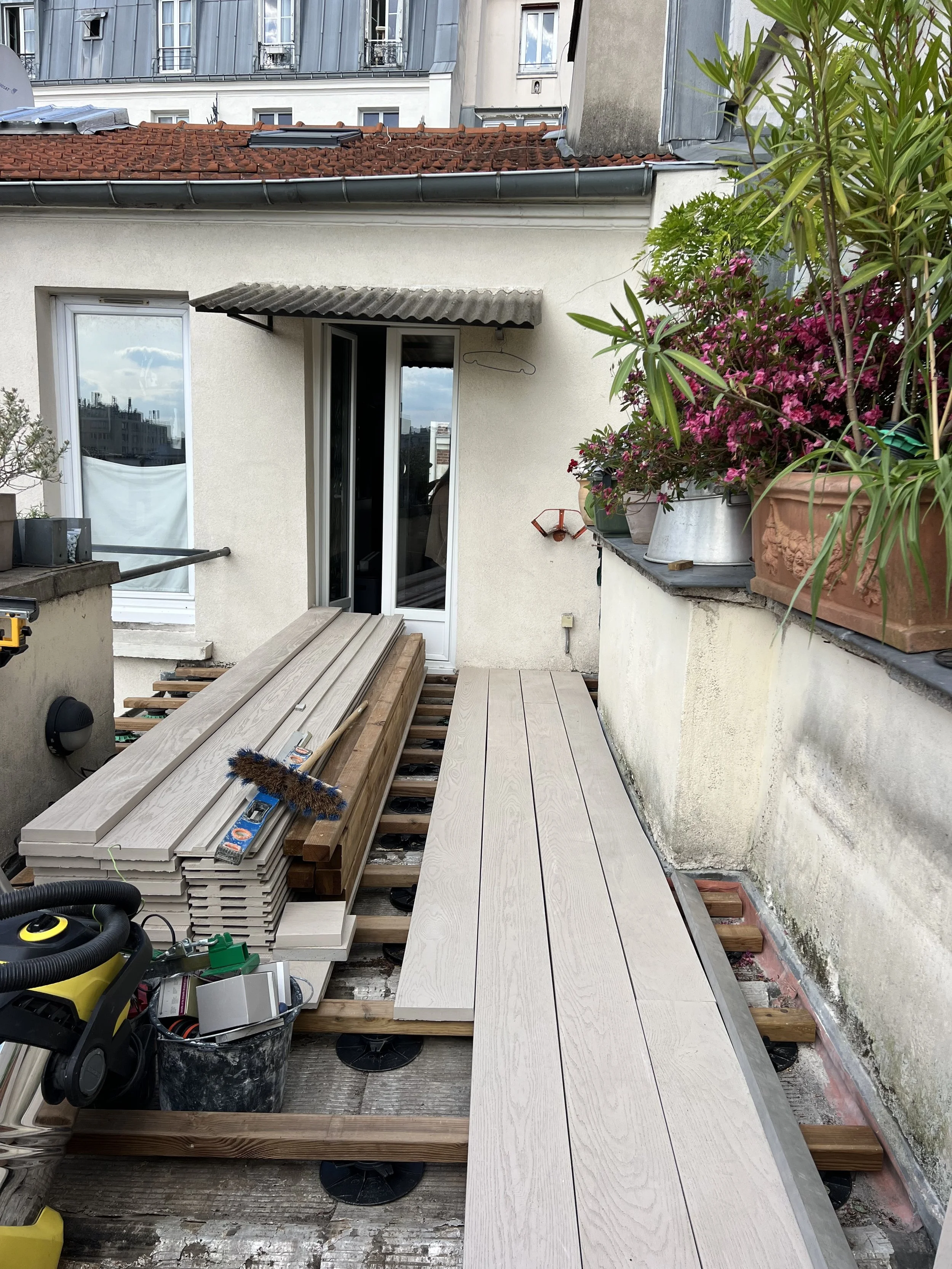 Les claustras assortis en Millboard offrent une continuité visuelle et protègent du vis-à-vis latéral, tout en préservant une vue dégagée sur la Tour Eiffel.