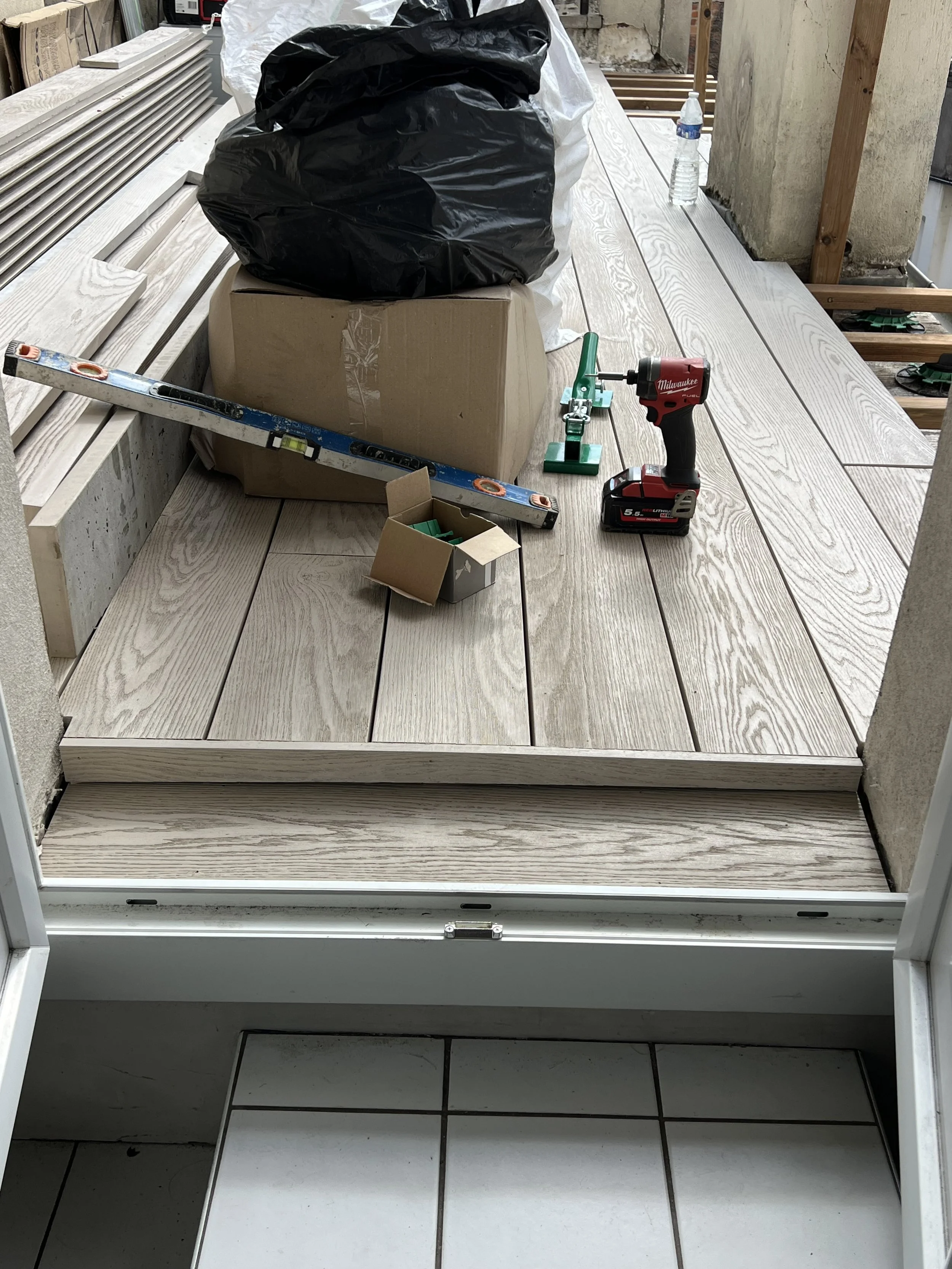 Aménagement d'une terrasse en lames Millboard, un matériau innovant composé de poussière de pierre et d’élasthanne, alliant durabilité et esthétique naturelle.