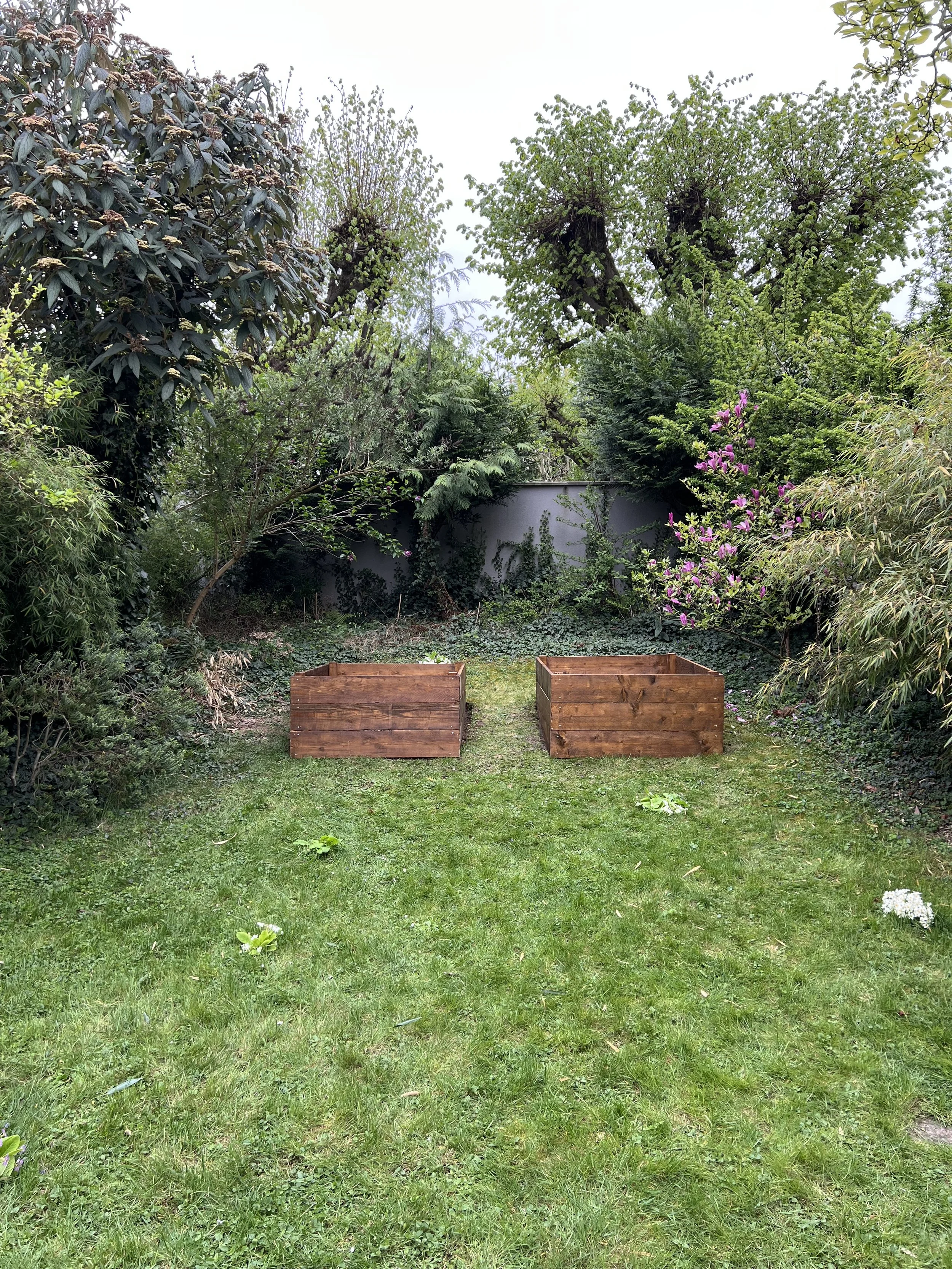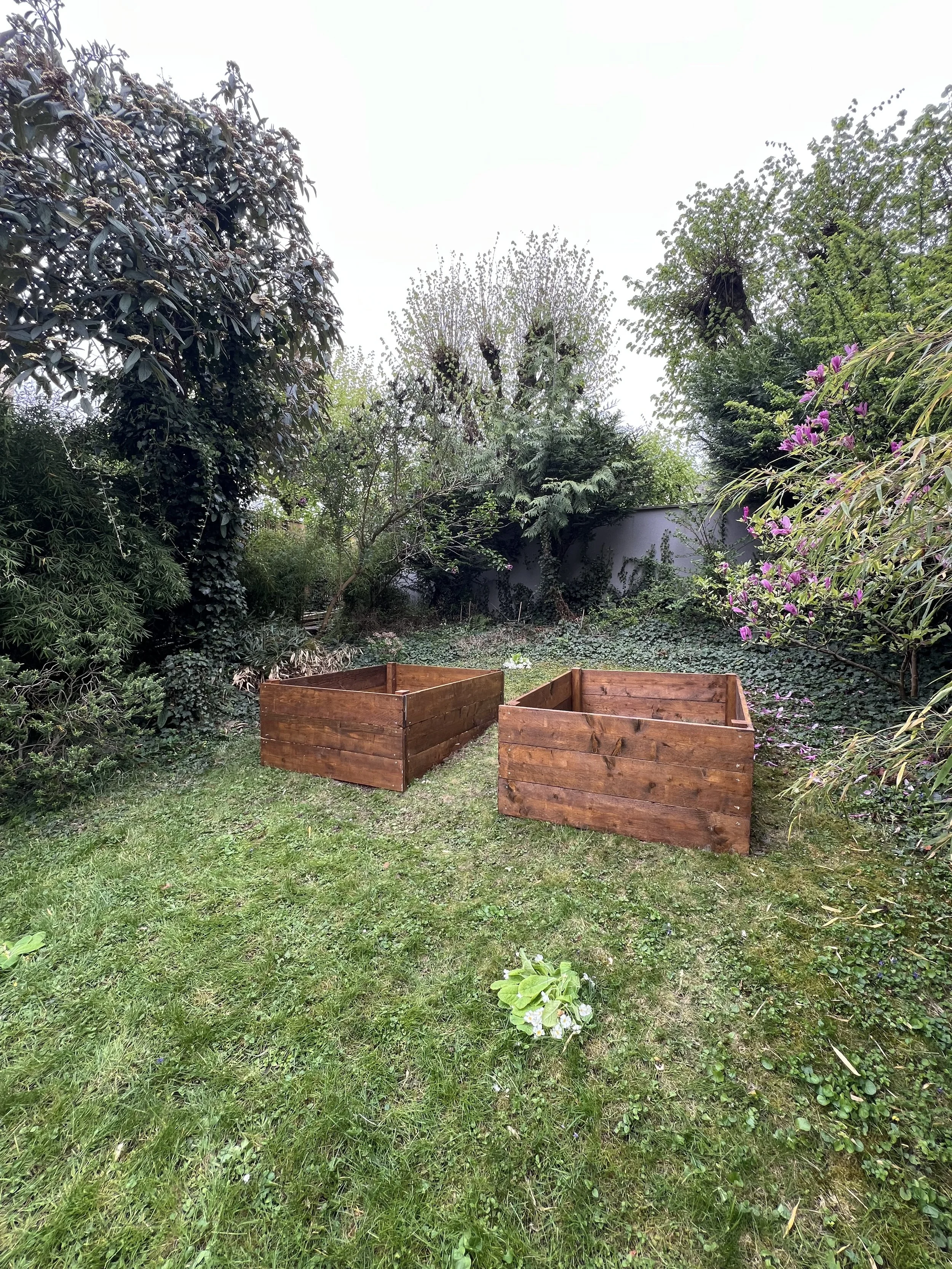 Construction et mise en place de deux bacs à plantes sur mesure sur terrain pentu.