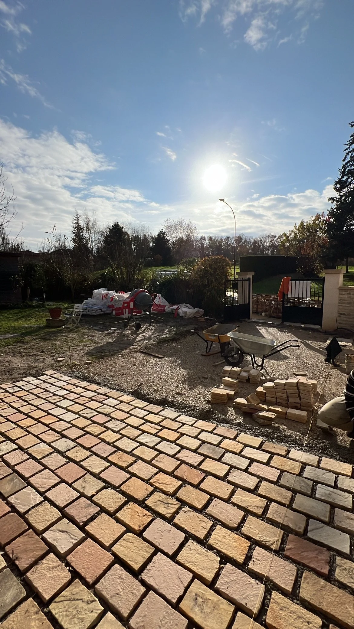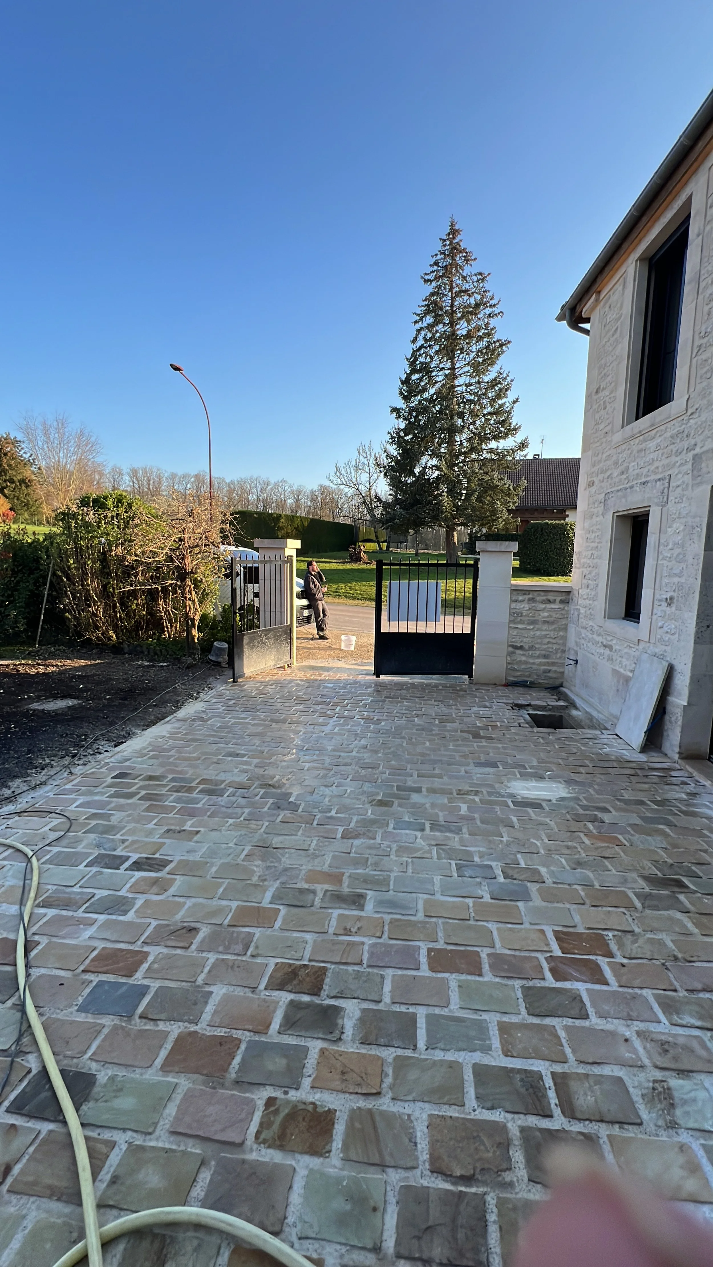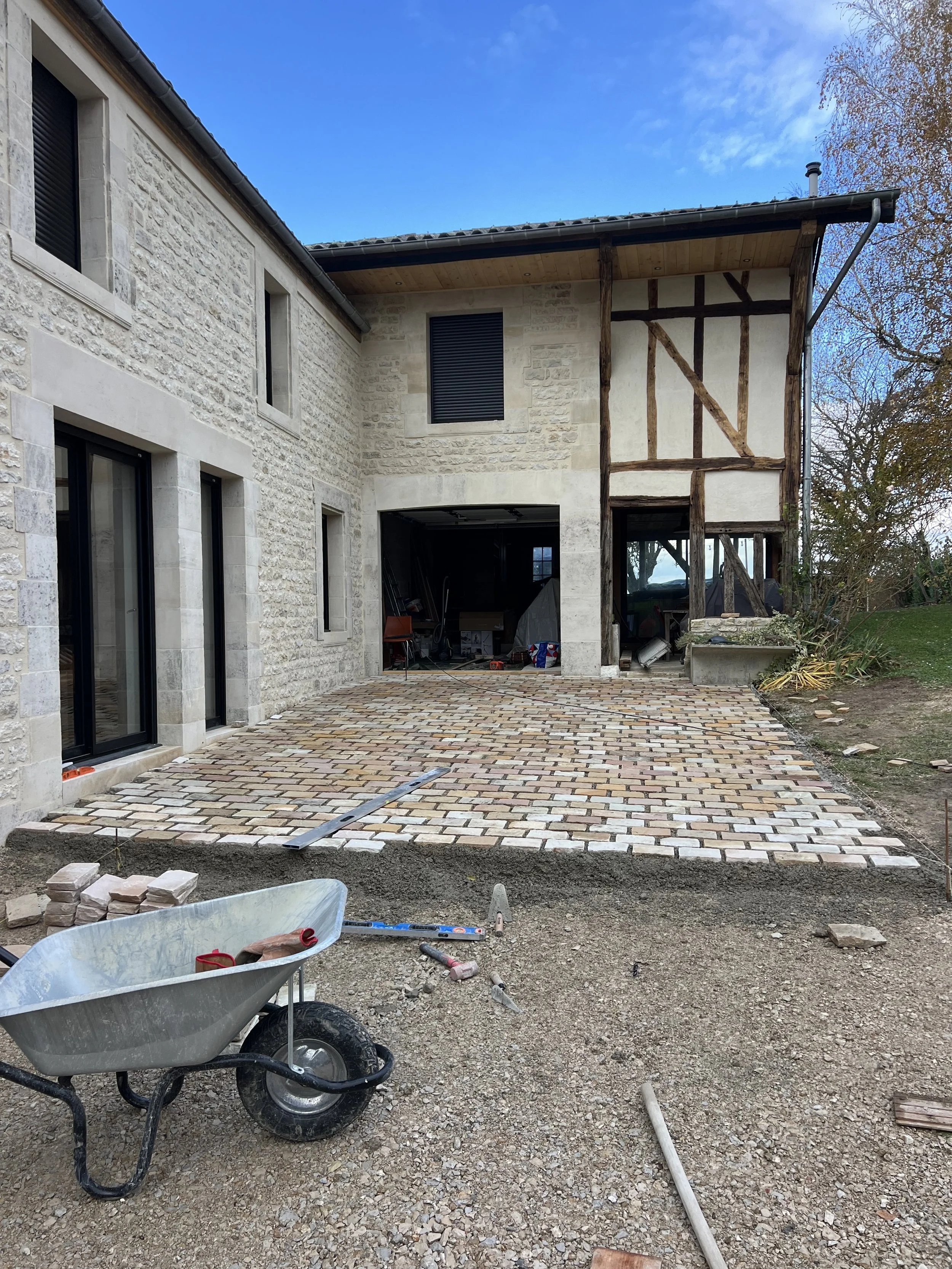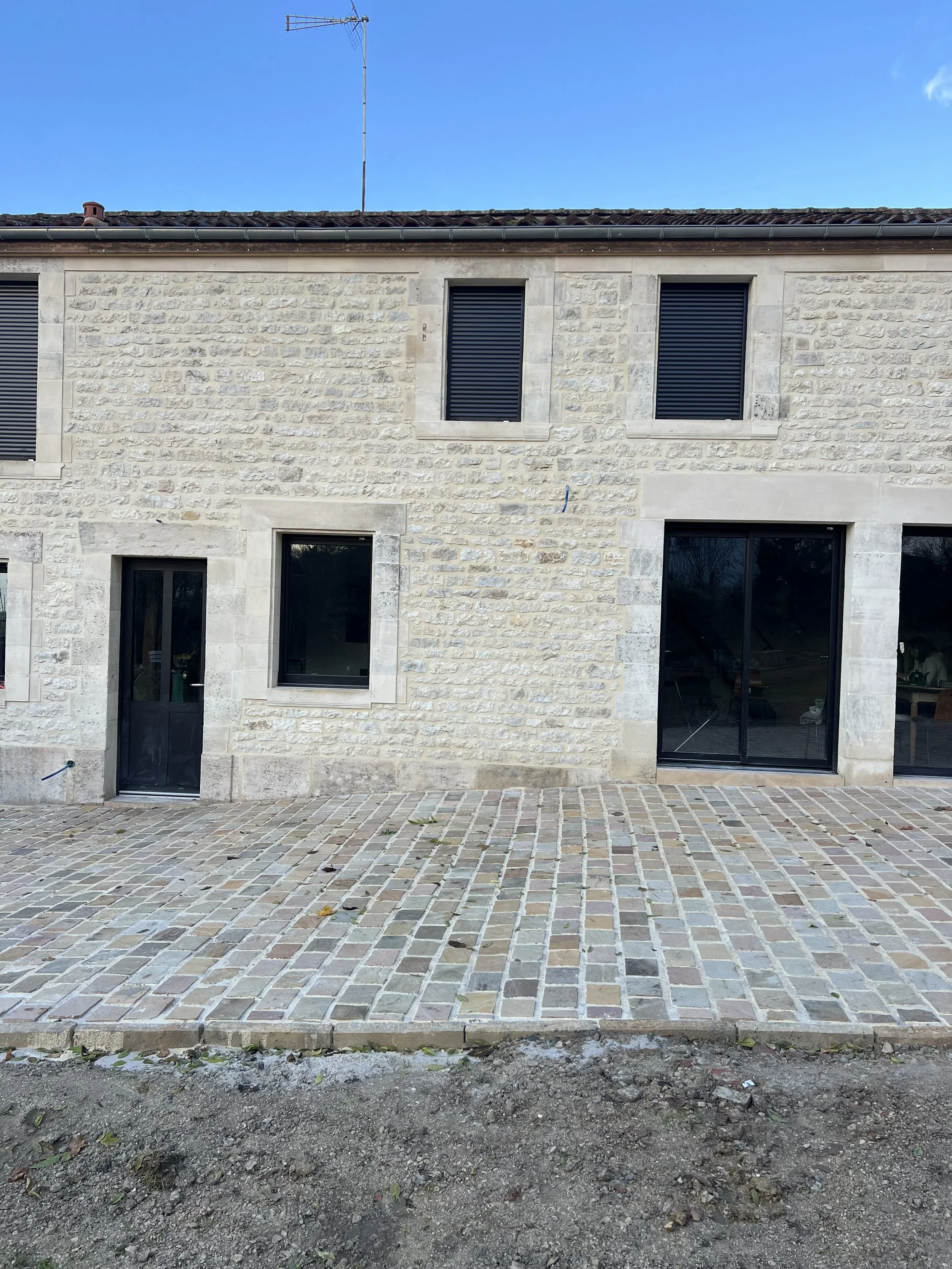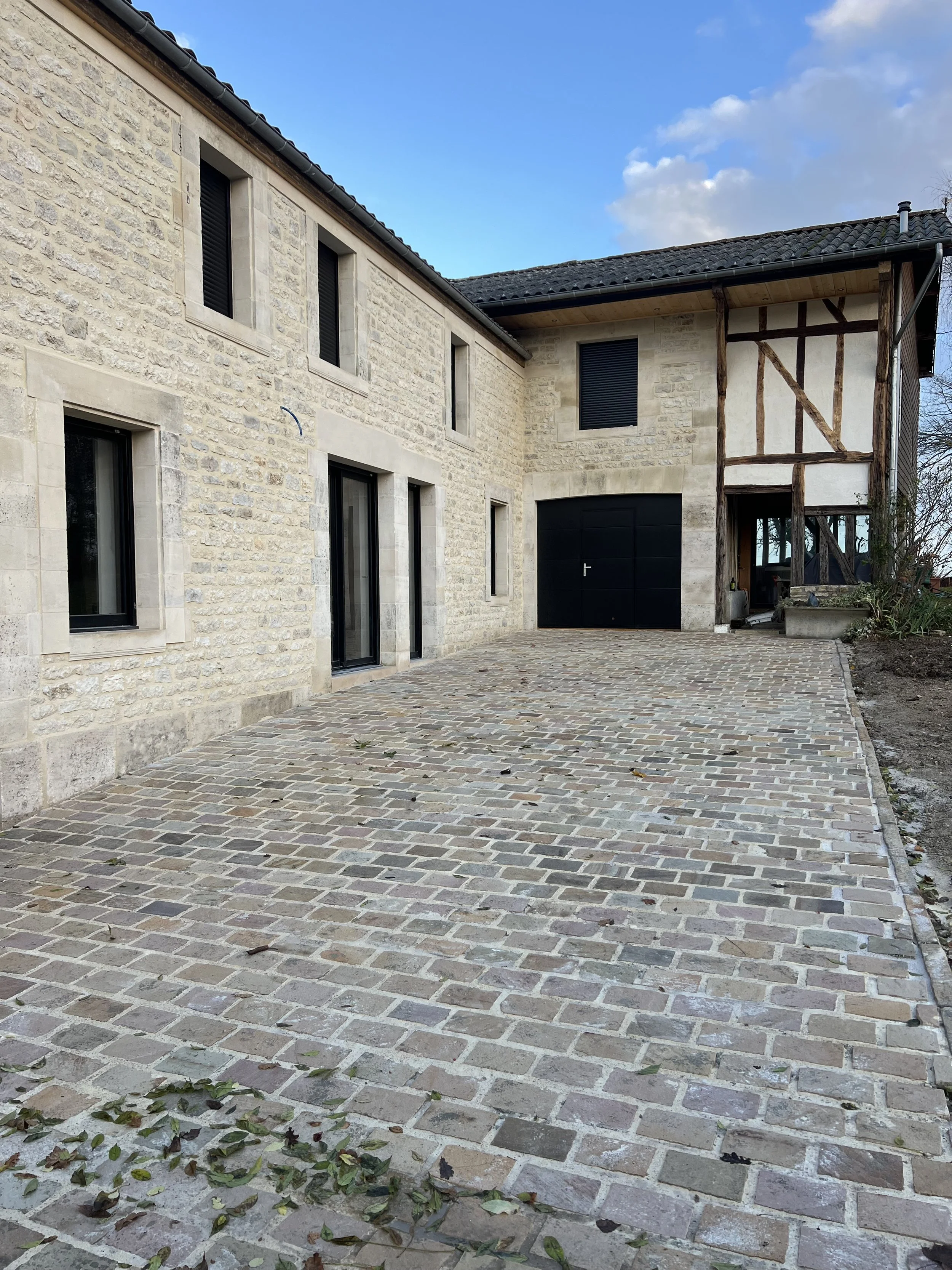 Cette cour consistait en la réalisation de 80 m² de pavage en pierre naturelle. Le revêtement a été choisi pour s’accorder avec la façade en pierre de la maison, créant ainsi une harmonie entre l’aménagement extérieur et l’architecture existante.