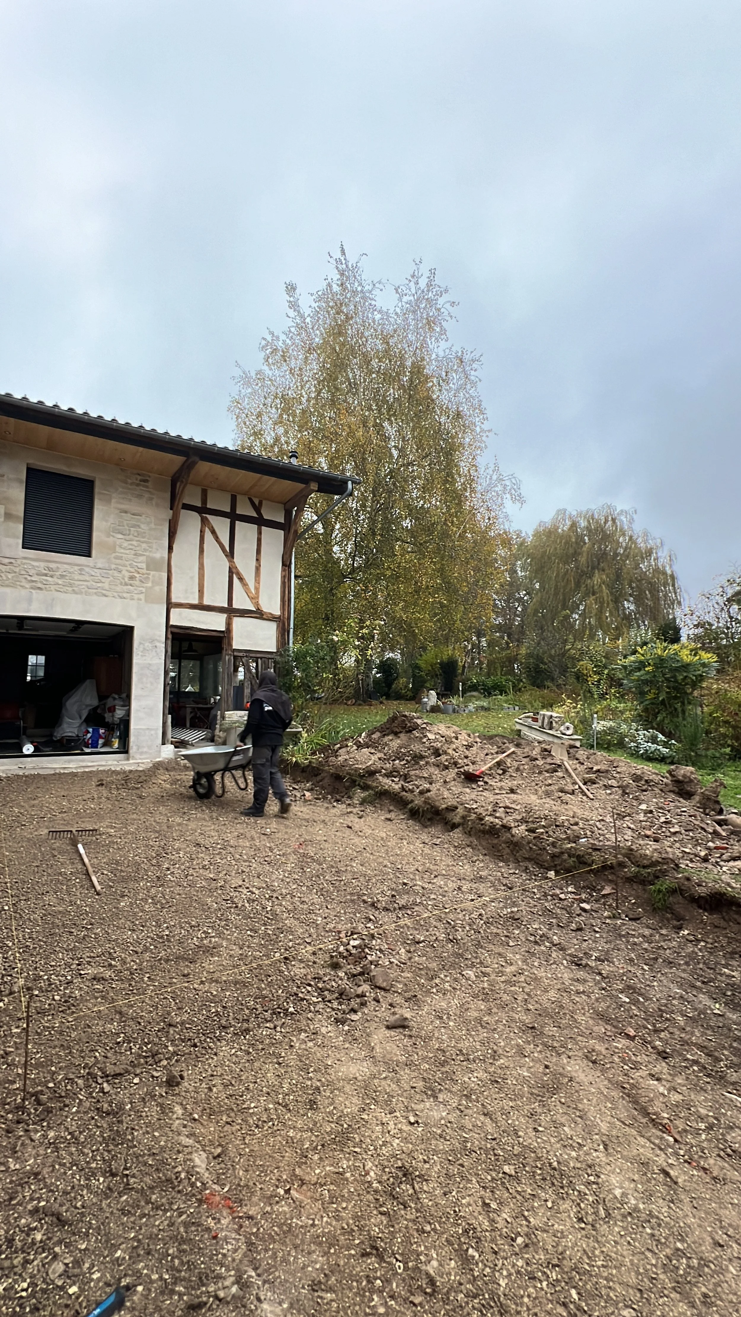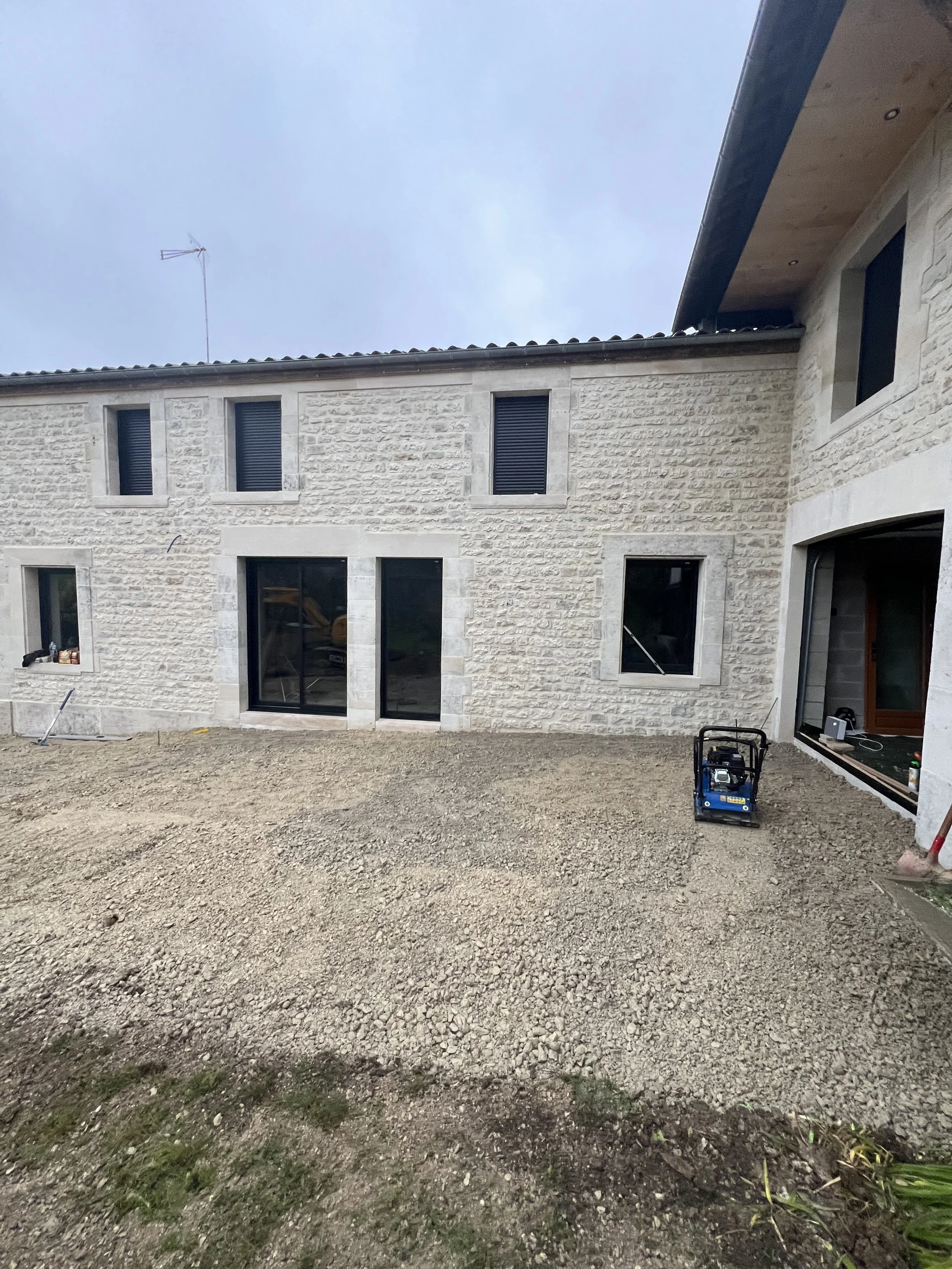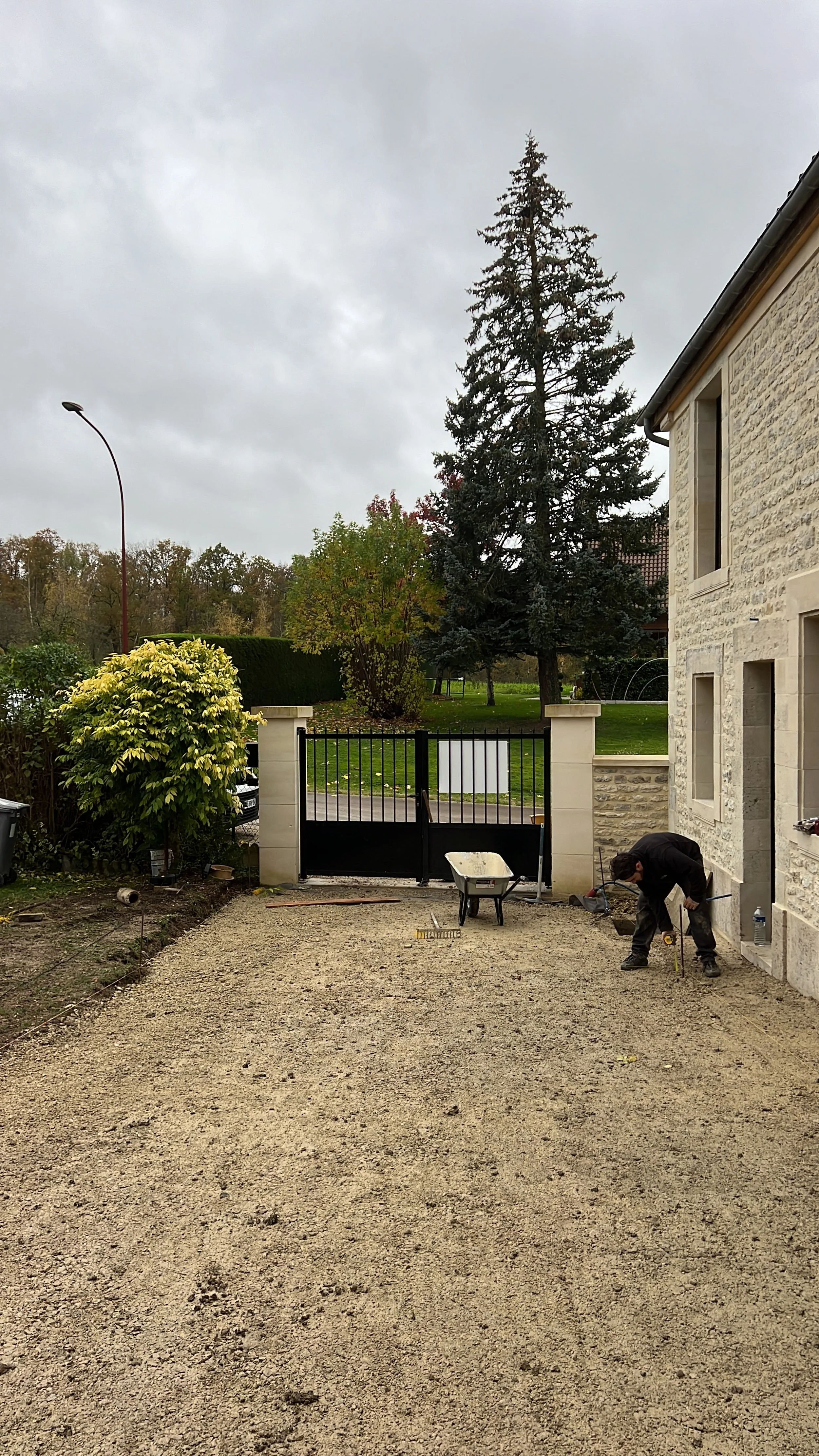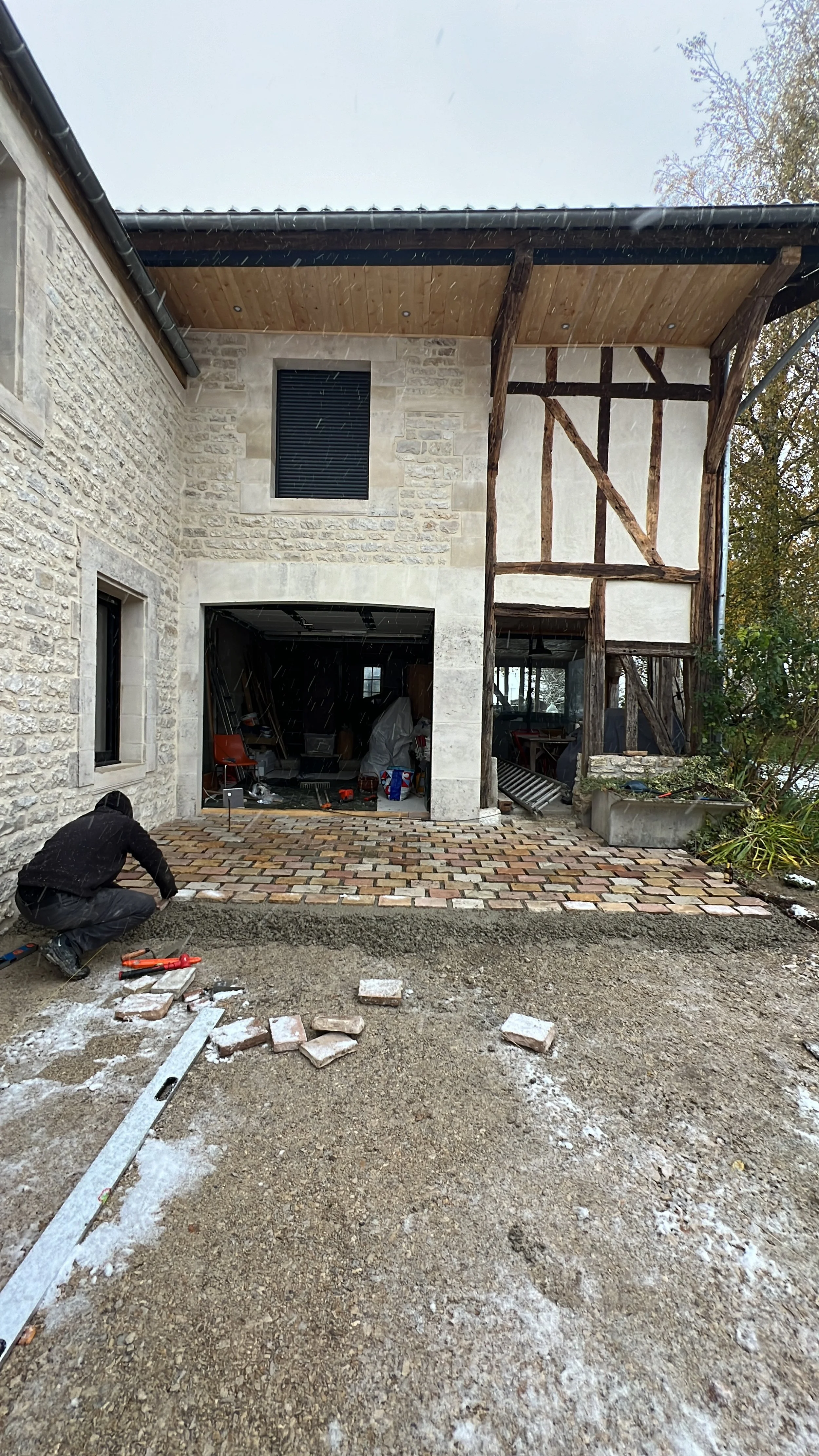 Cette cour consistait en la réalisation de 80 m² de pavage en pierre naturelle. Le revêtement a été choisi pour s’accorder avec la façade en pierre de la maison, créant ainsi une harmonie entre l’aménagement extérieur et l’architecture existante.